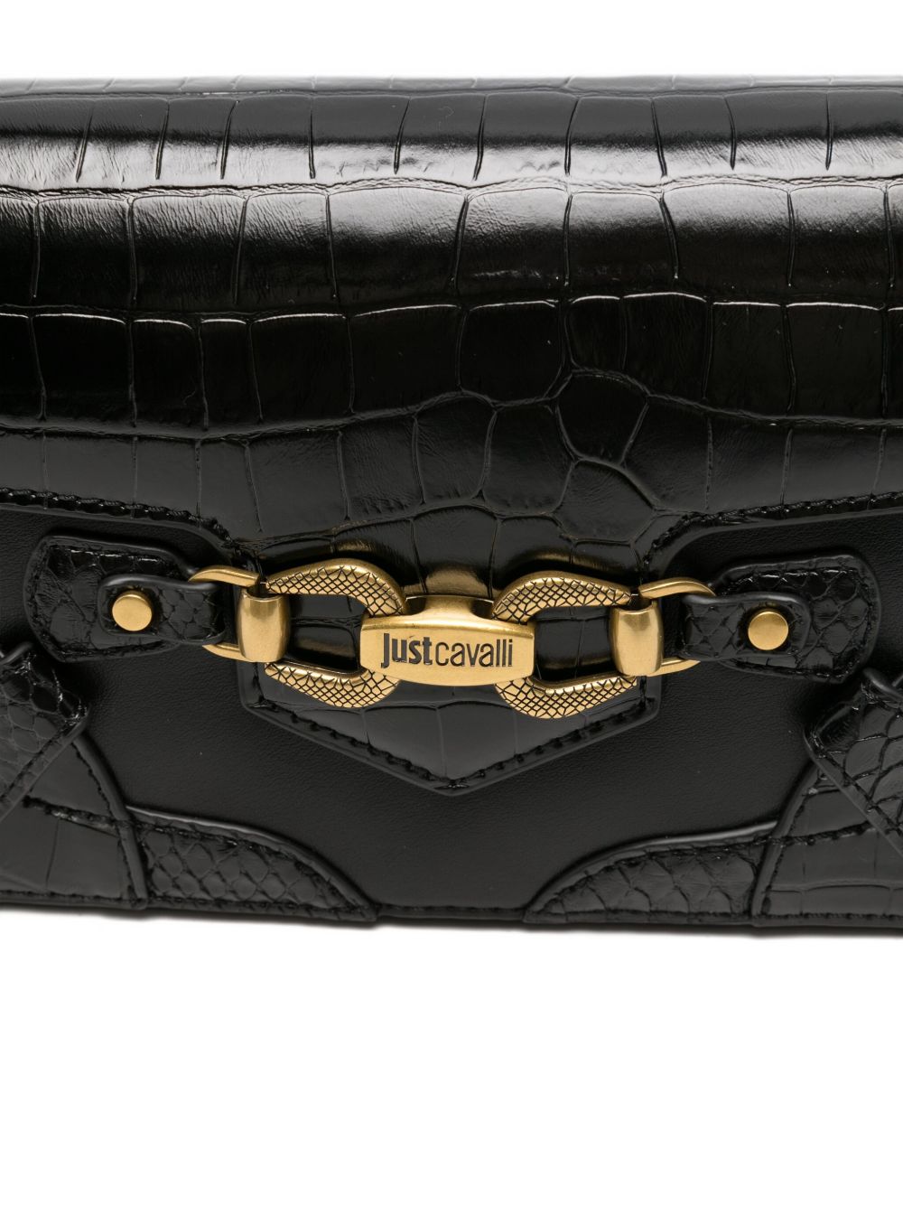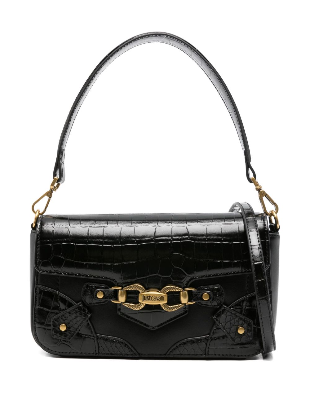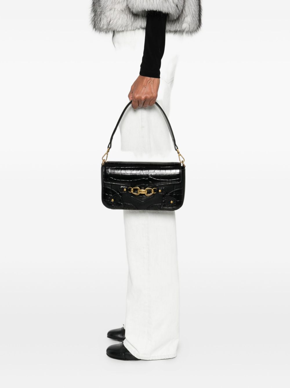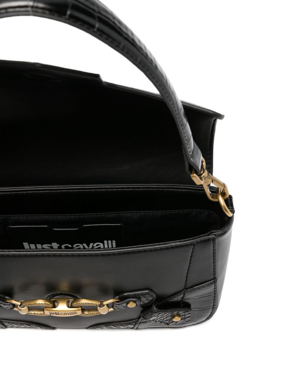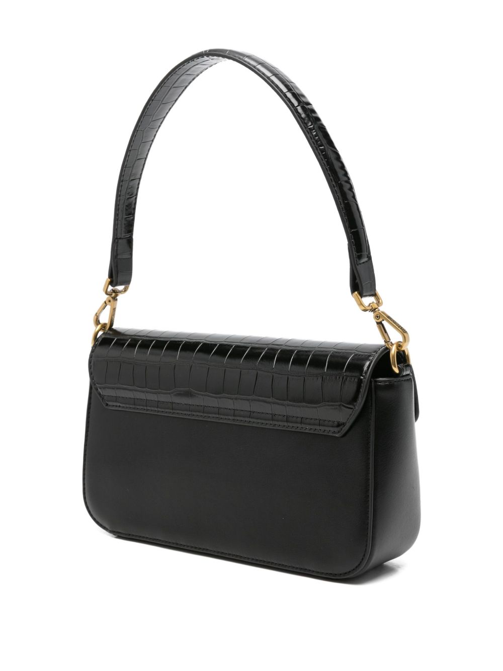realizzata in ecopelle, finitura lucida effetto coccodrillo goffrato, manico singolo regolabile e removibile, logo placcato in metallo color oro, chiusura superiore con pattina e bottone magnetico, scomparto unico