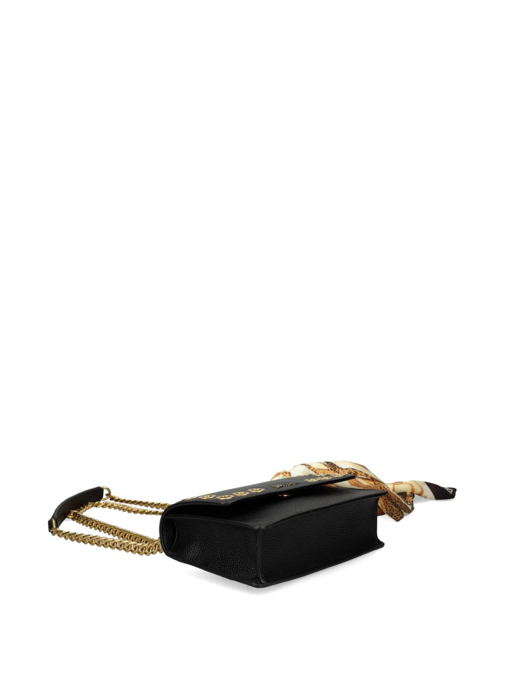 Realizzata in poliuretano, tracolla con catena, logo e occhielli in metallo color oro, scomparto unico, dettaglio foulard, 100% poliuretano