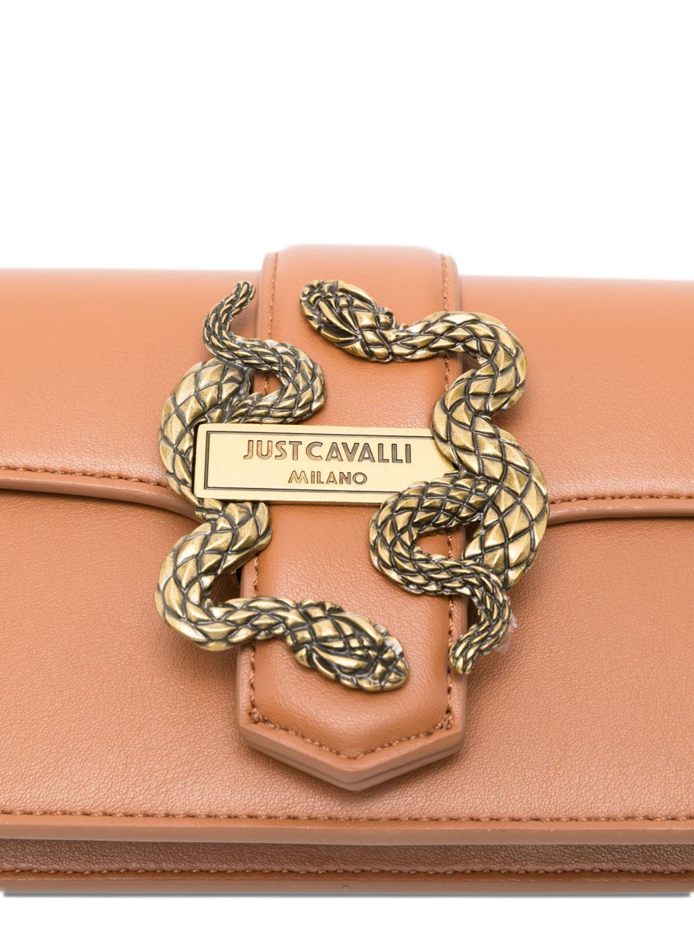 Realizzata in resina poliuretanica, chiusura con patta, fibbia a forma di serpente con applicazione logata color oro, scomparti interni di cui uno con zip, catena removibile, altezza 10 cm, profondità 3 cm, larghezza 20 cm, 100% resina poliuretanica, 100% poliestere