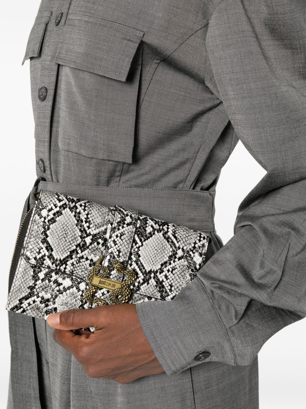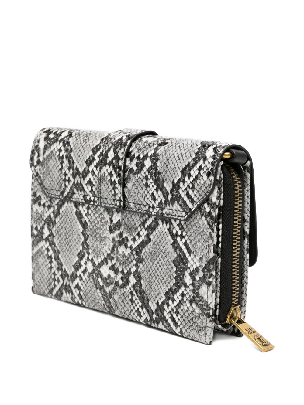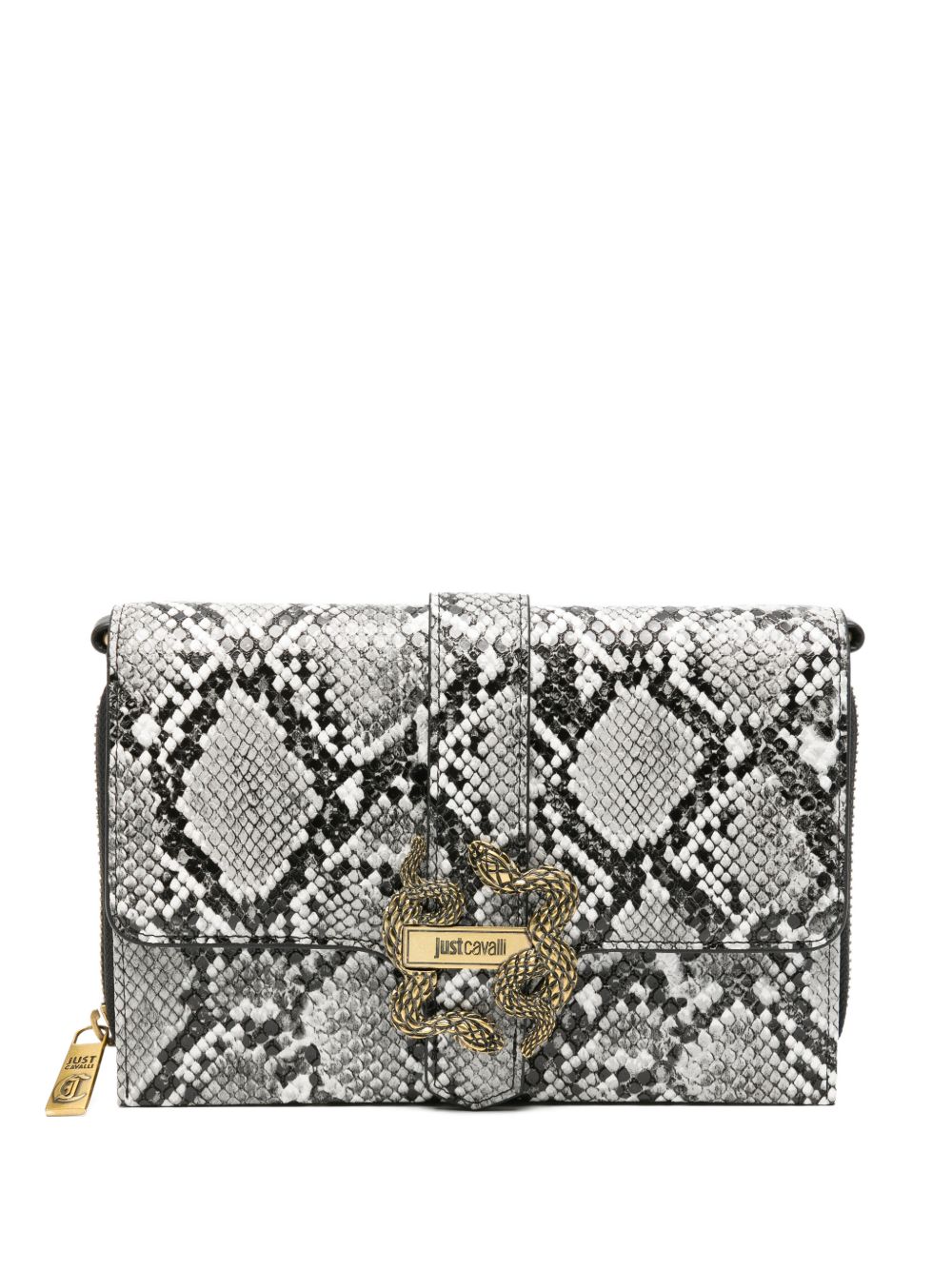 Borsa Just Cavalli da donna in ecopelle con combinazione cromatica bianco e nero, caratterizzato da logo snakes metallico frontale che richiama lestetica iconica del brand.