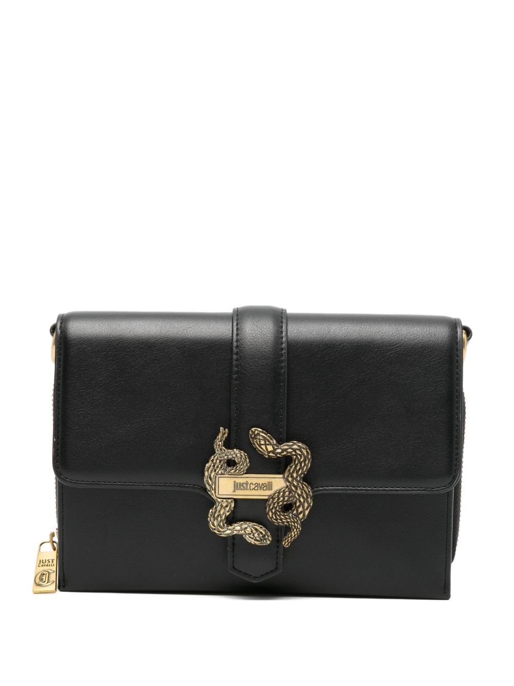 Borsa Just Cavalli da donna a tracolla in colore nero, con patta frontale, dettaglio metallico dorato a serpenti intrecciati e tracolla a catena.