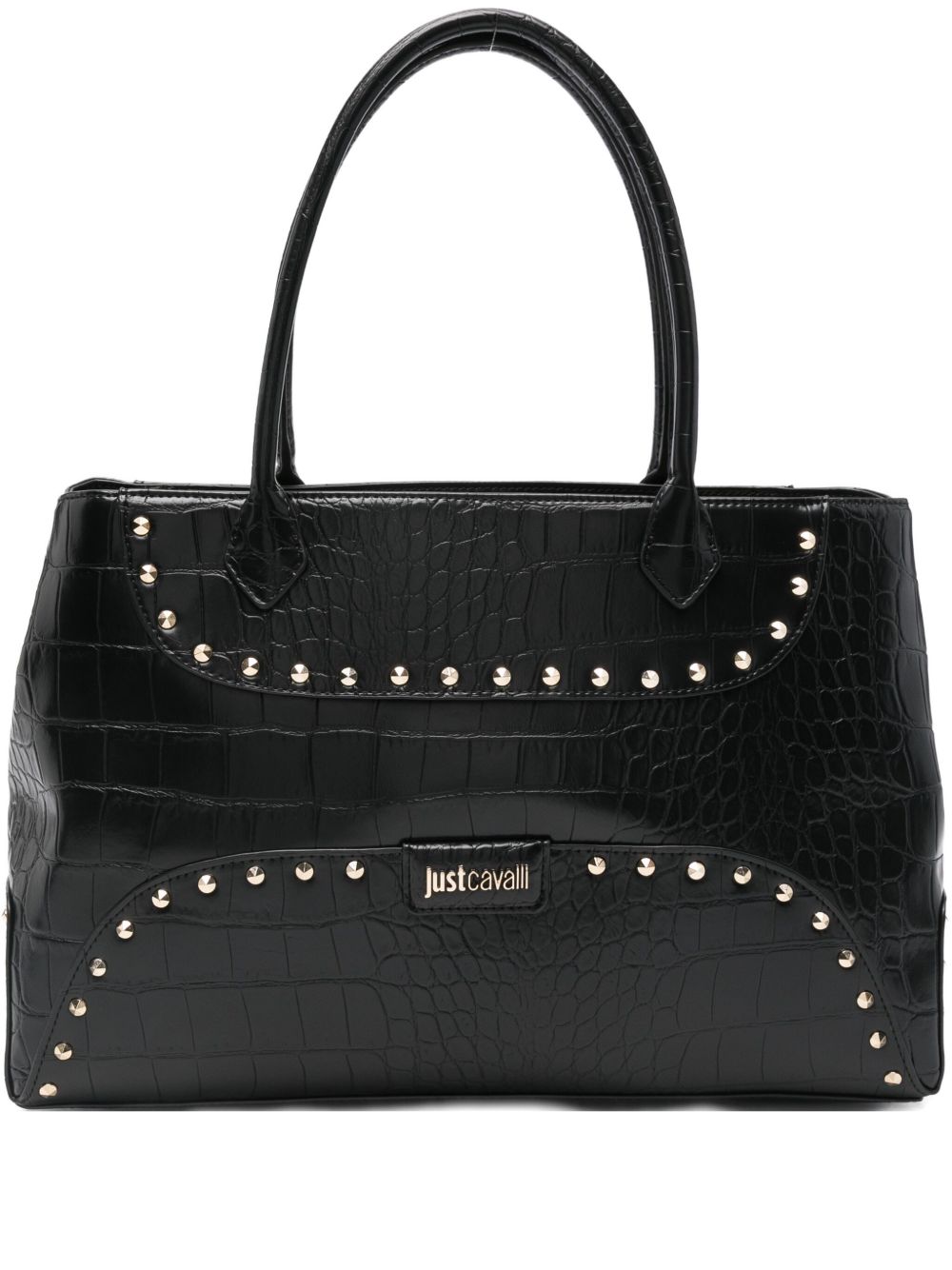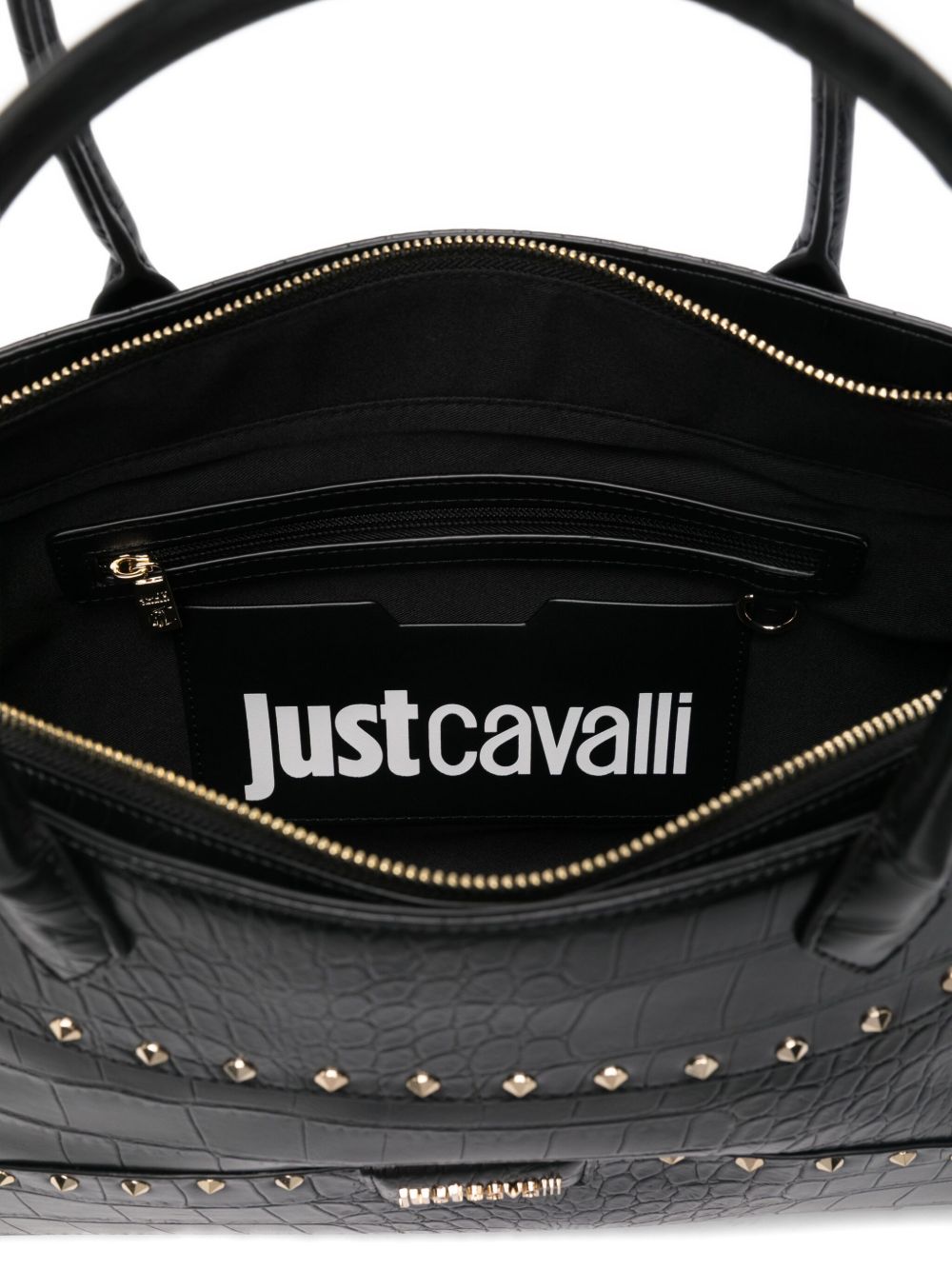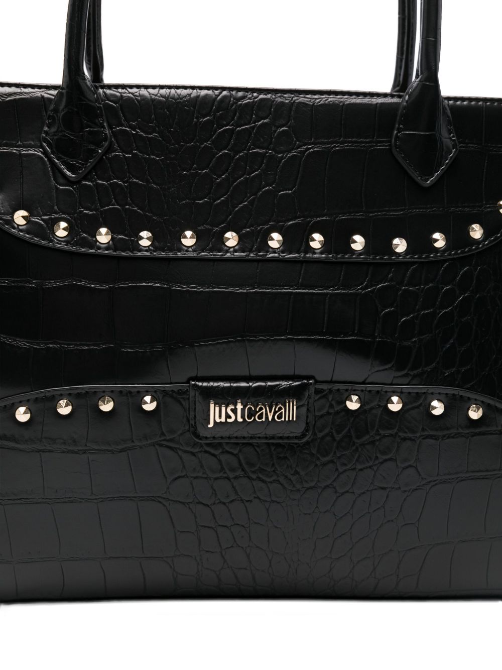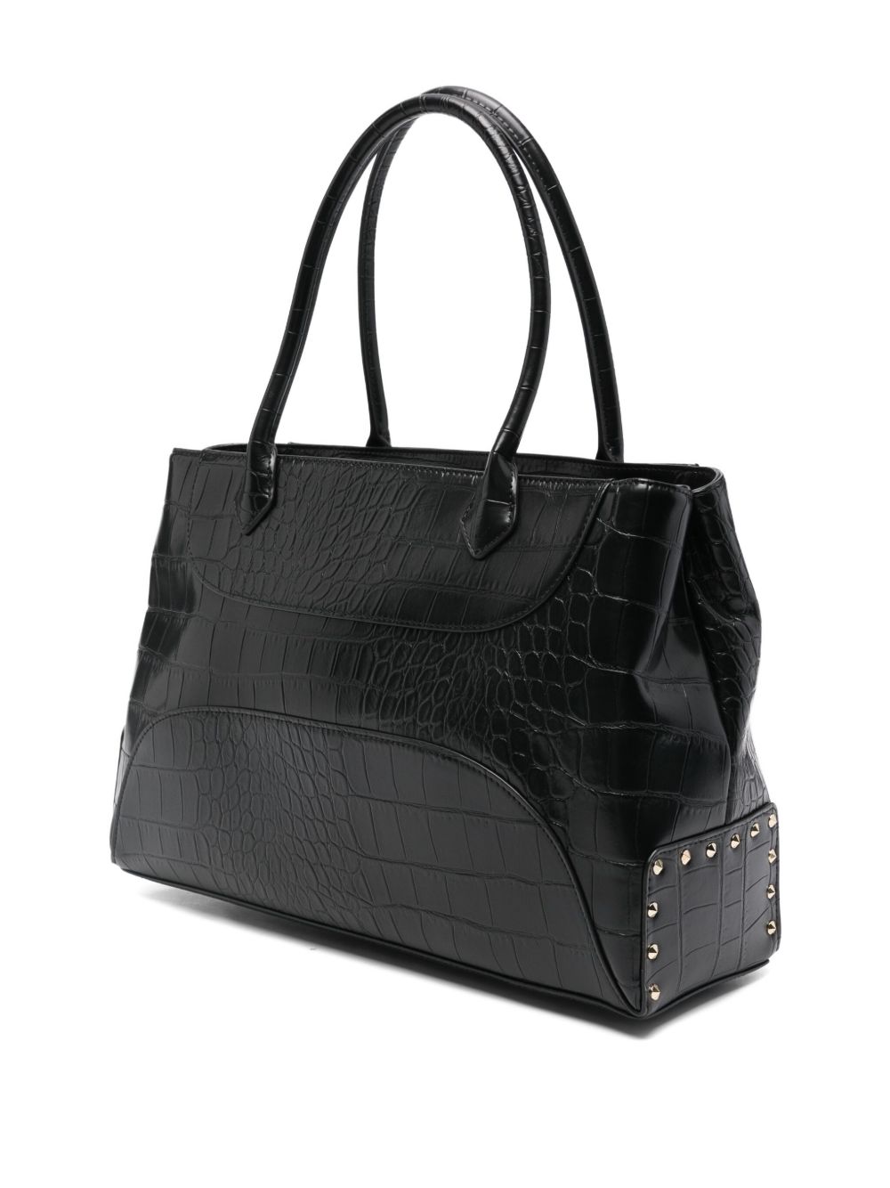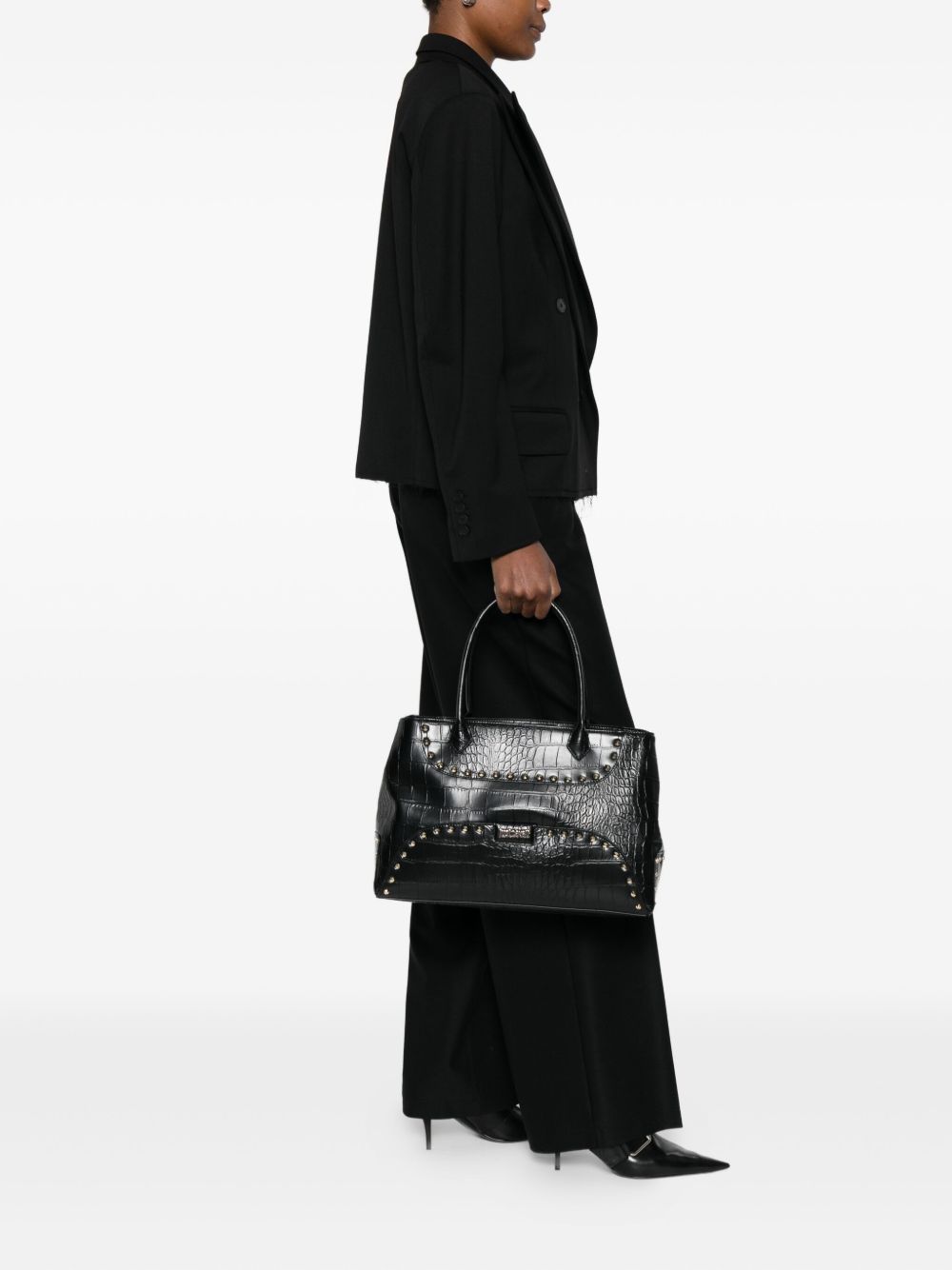 realizzata in ecopelle, finitura lucida effetto coccodrillo, doppio manico, logo e borchie decorative in metallo color oro, chiusura superiore con zip, tasca interna con cerniera