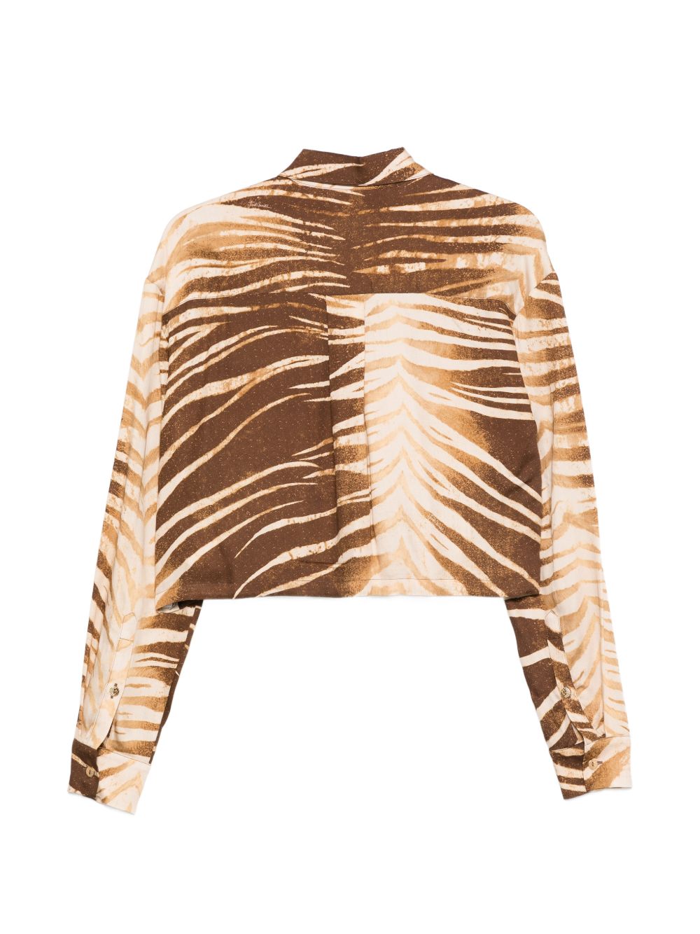 Realizzata in viscosa, stampa animalier, chiusura con bottoni, colletto classico, due tasche davanti con bottone, maniche lunghe, design croppato, 100% viscosa