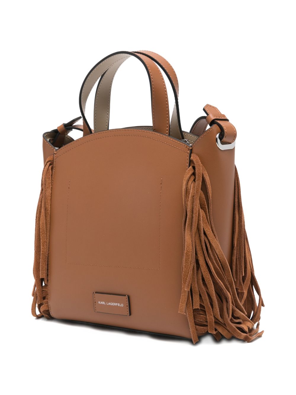 Realizzata in pelle di mucca, due manici, logo davanti con borchie, chiusura superiore con zip, frange in pelle scamosciata sui lati, altezza 23 cm, larghezza 25 cm, profondità 10 cm, 100% pelle di mucca