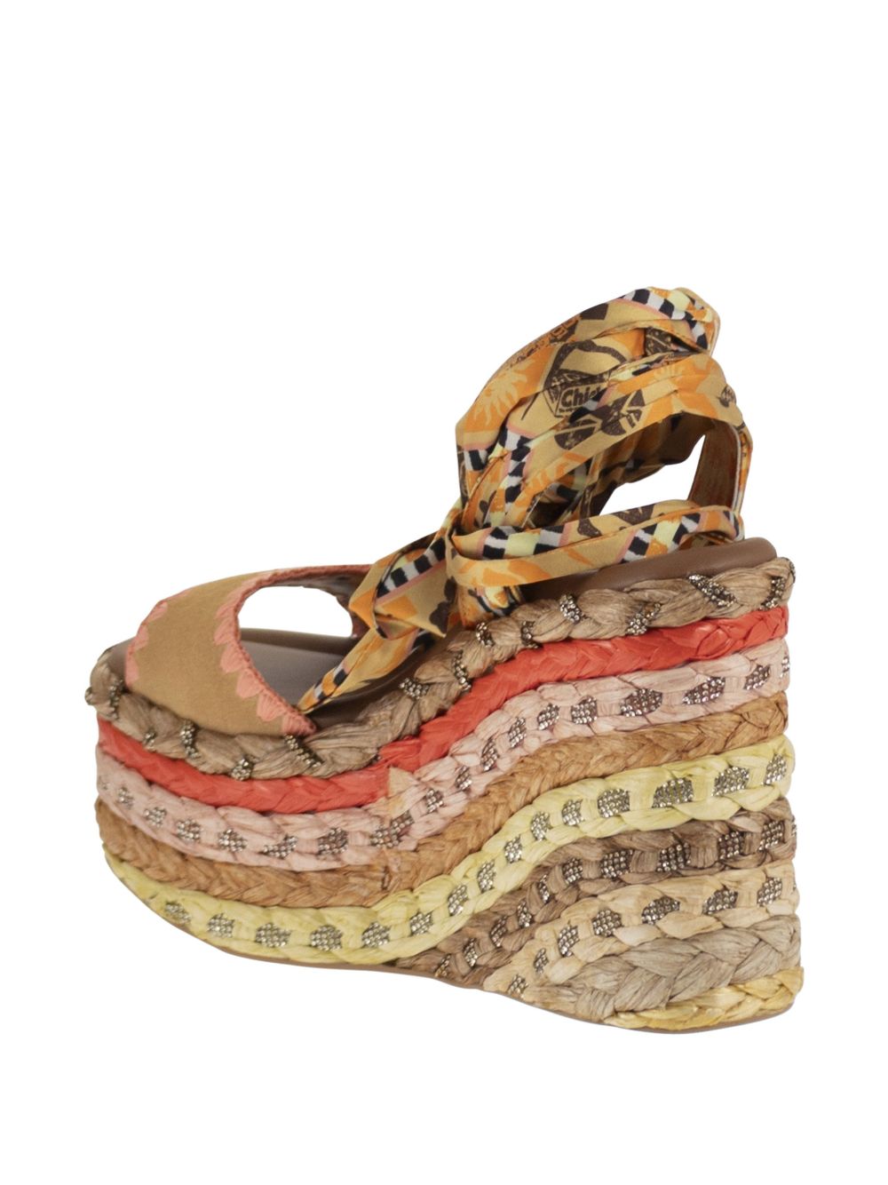 tomaia realizzata in suede, zeppa in rafia e cristalli intrecciati, chiusura alla caviglia con laccino regolabile, dettaglio con foulard, altezza zeppa 12 cm