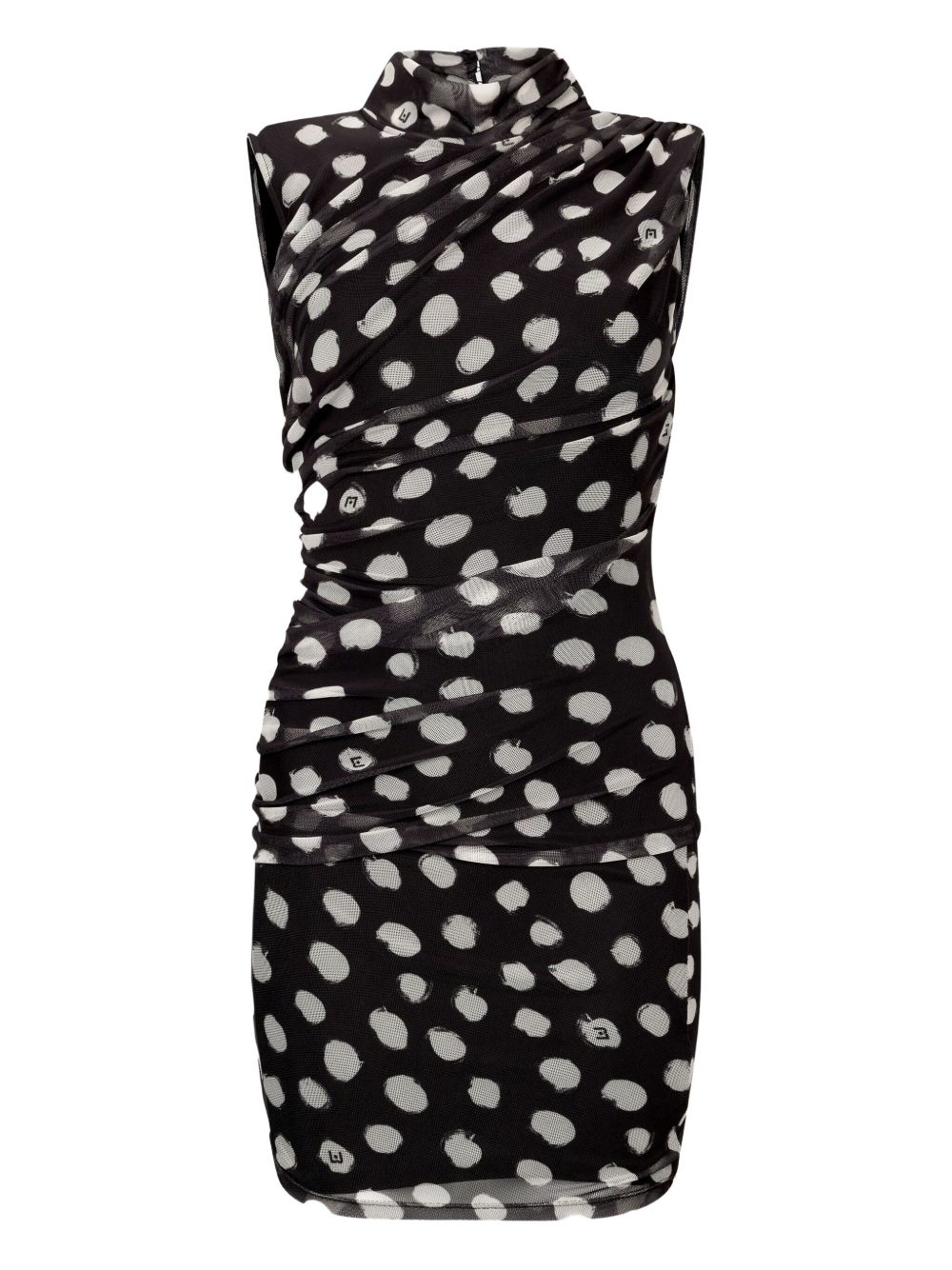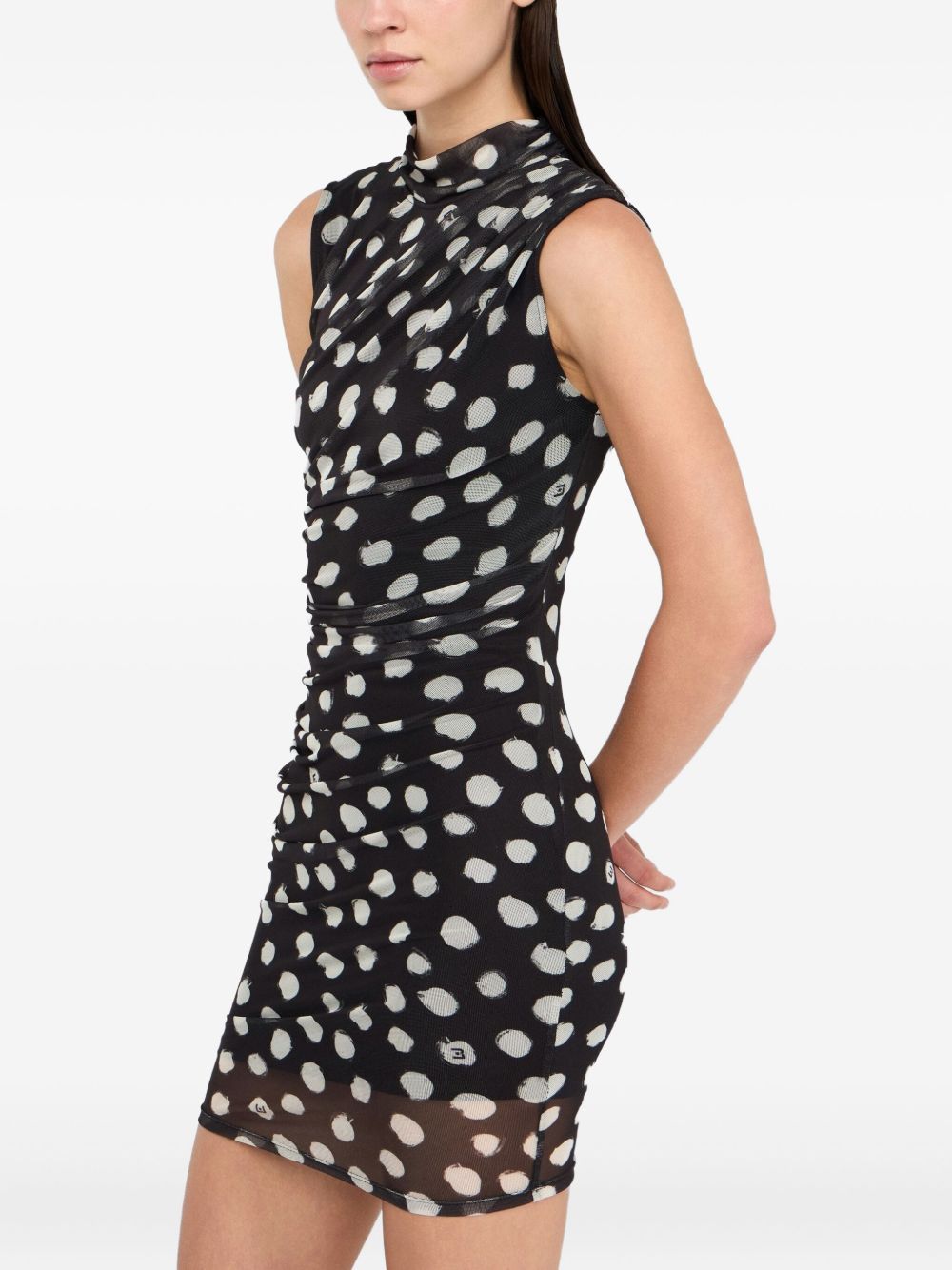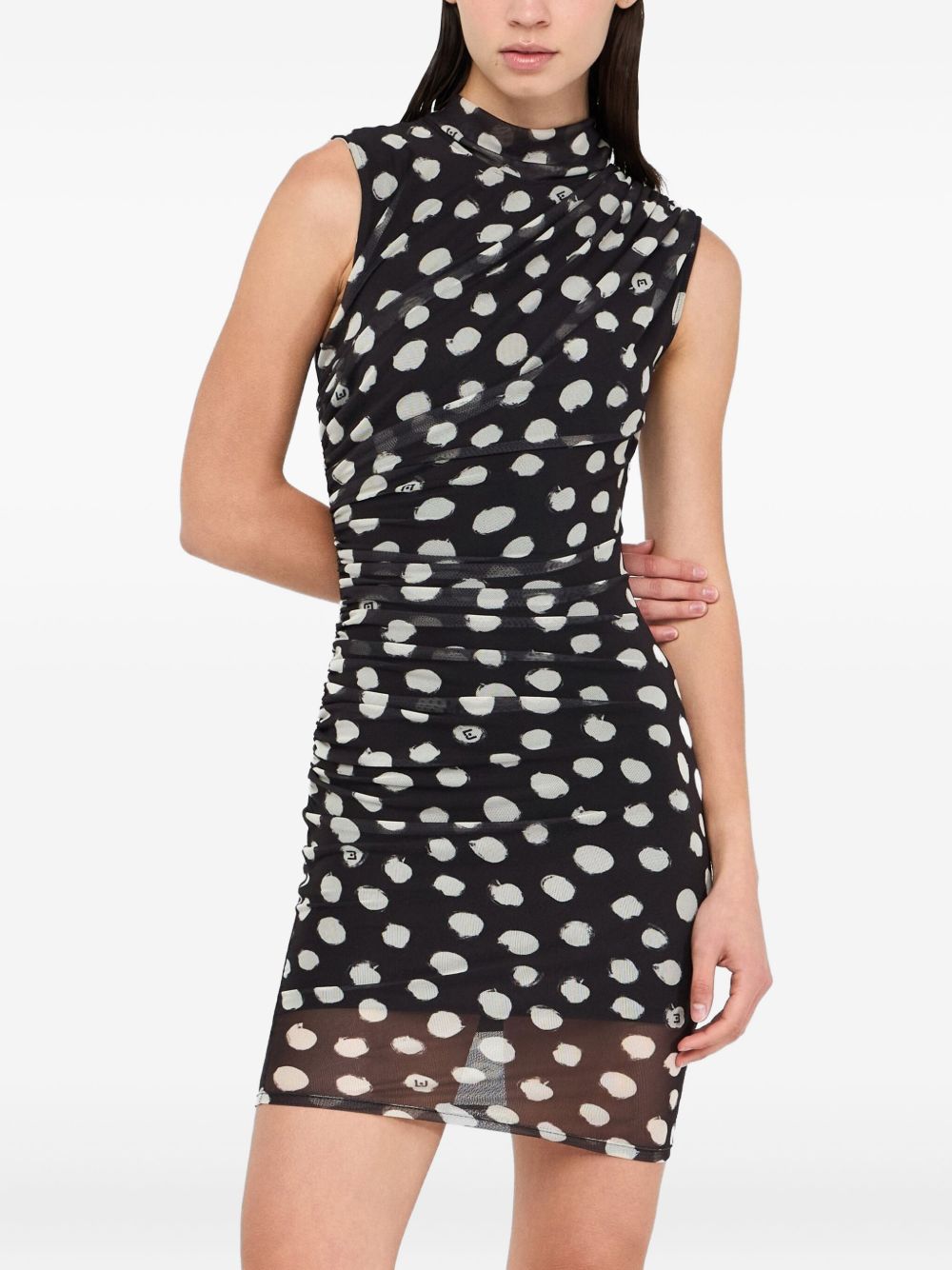 realizzato in jersey stretch, stampa a pois all over, drappeggi laterali, lunghezza sopra al ginocchio, chiusura a goccia sul retro, 95% poliestere, 5% elastan