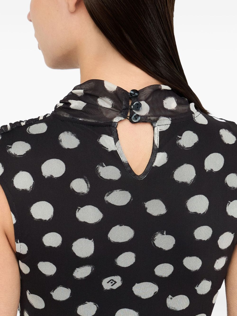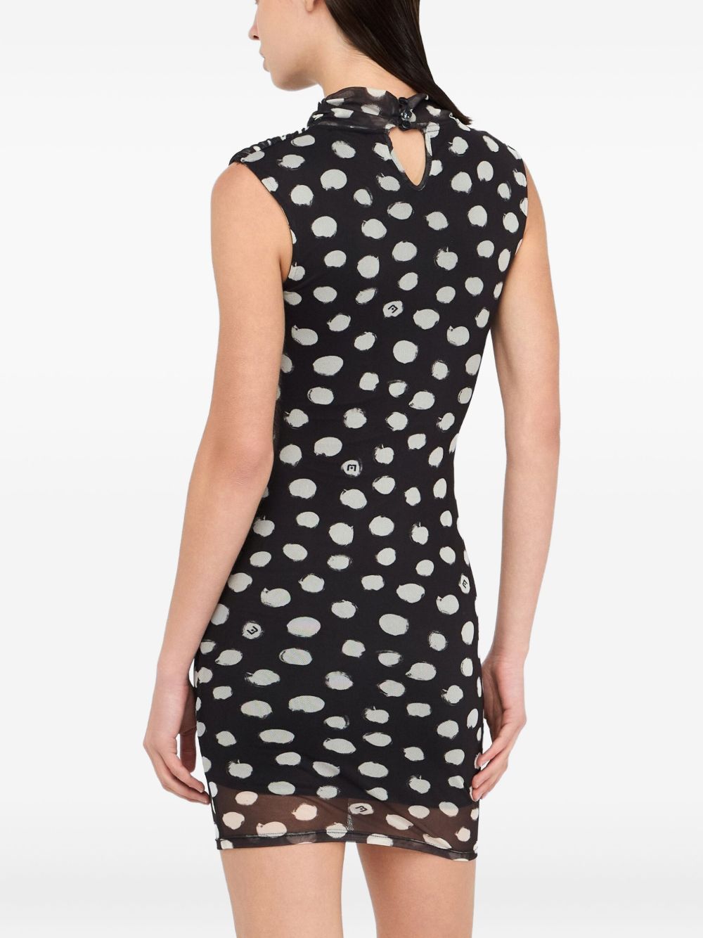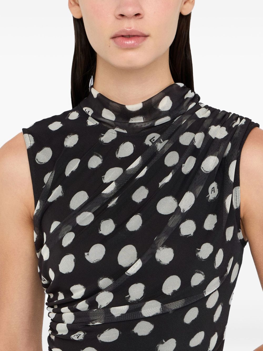 realizzato in jersey stretch, stampa a pois all over, drappeggi laterali, lunghezza sopra al ginocchio, chiusura a goccia sul retro, 95% poliestere, 5% elastan