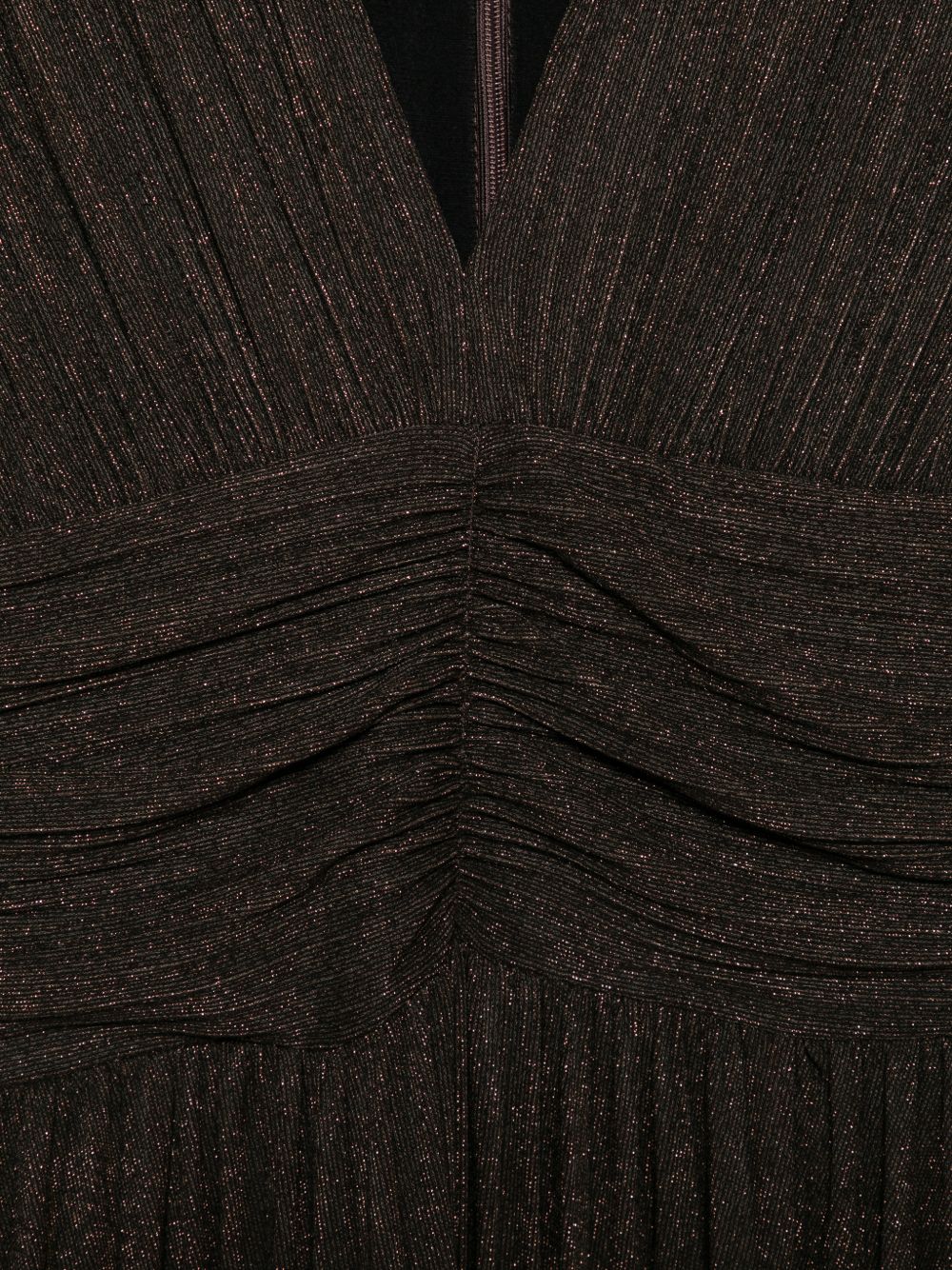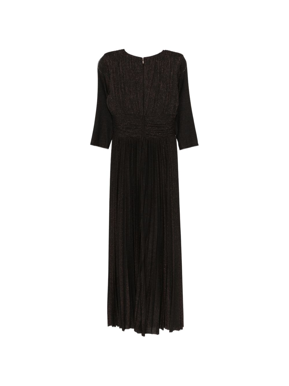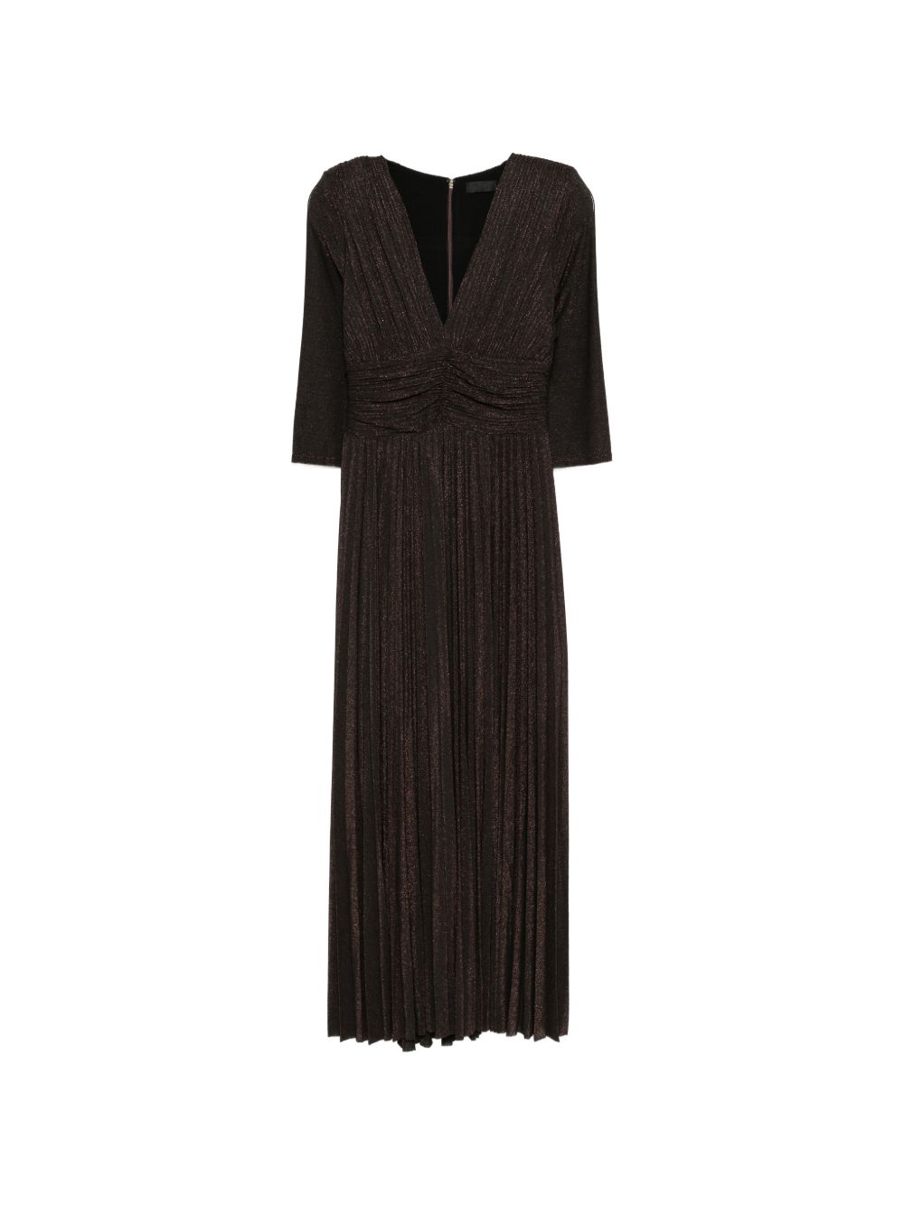 Abito lungo Liu Jo da donna realizzato in tessuto lurex color marrone con scollo a V e maniche tre quarti, perfetto per un look elegante e luminoso.