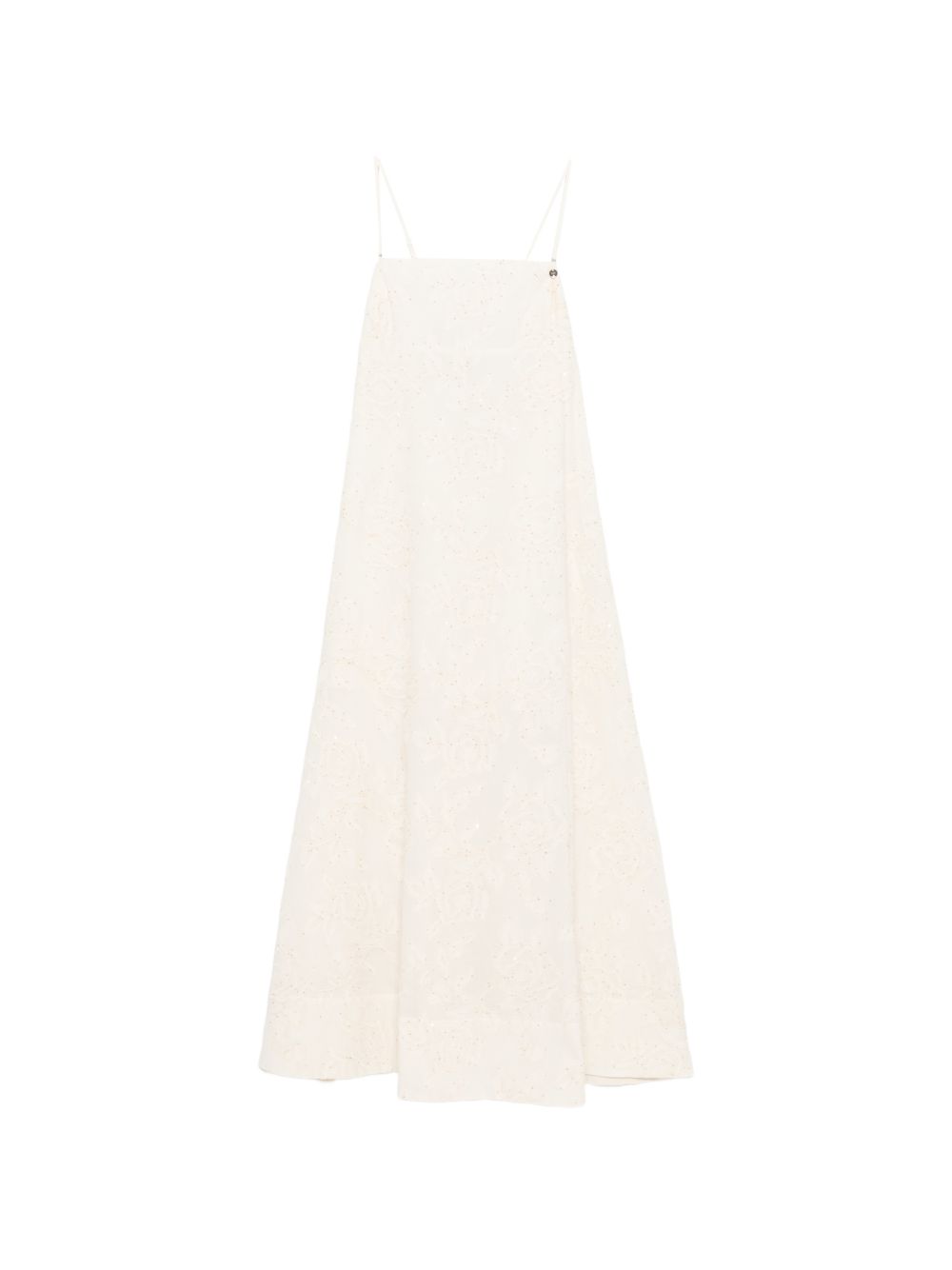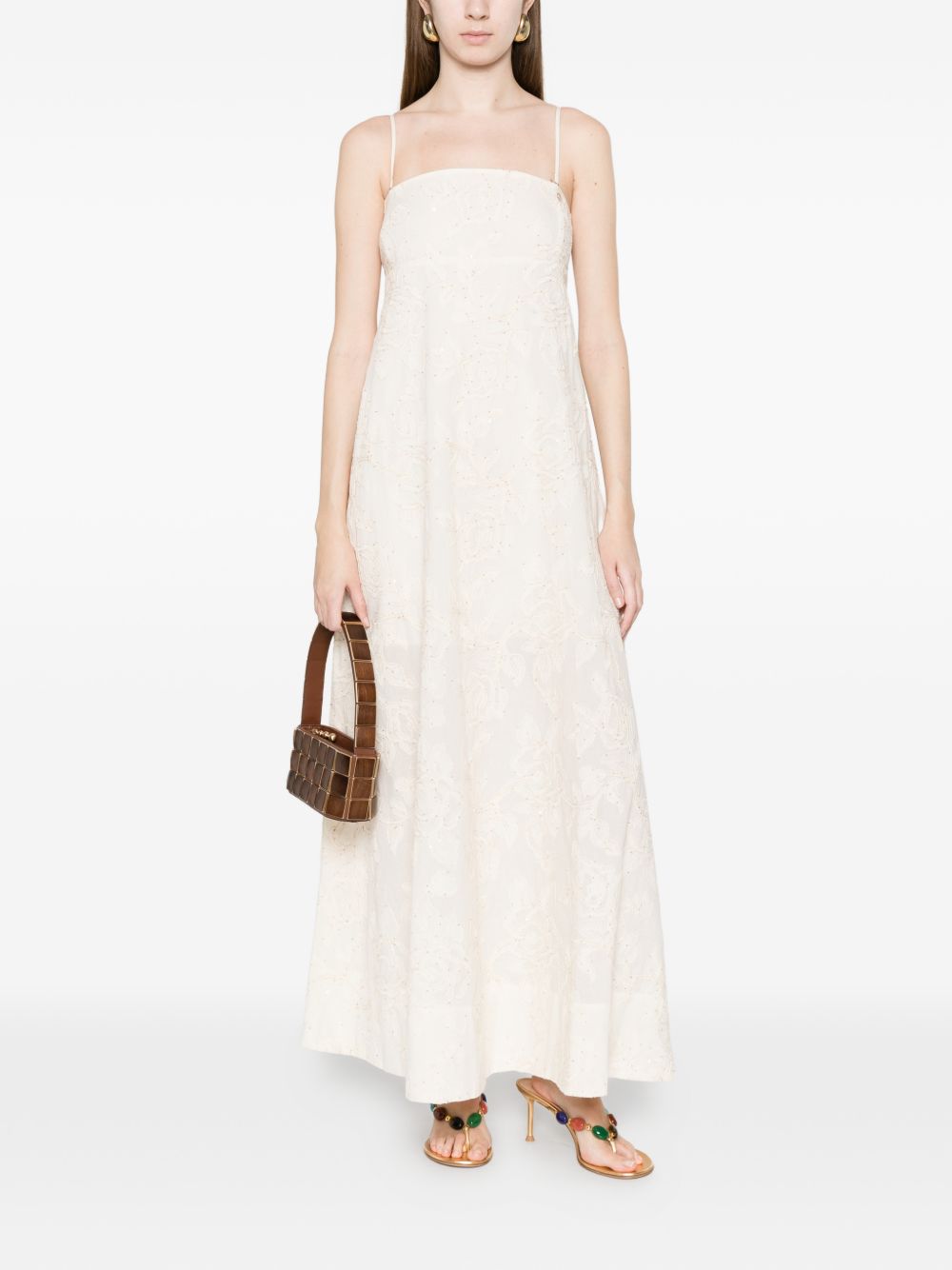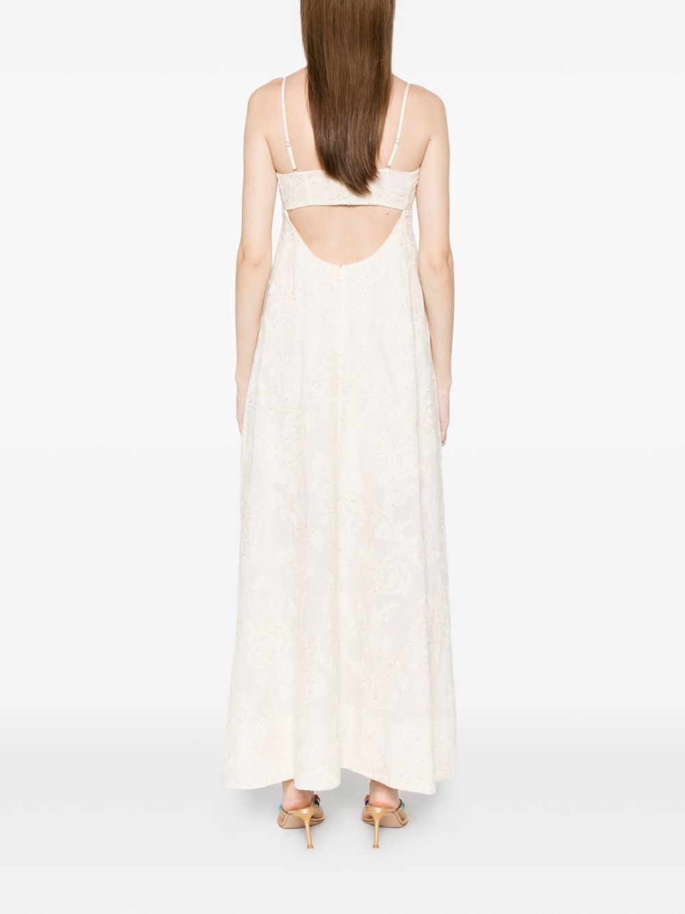 Abito lungo Liu Jo da donna con ricami e paillettes su base panna, caratterizzato da design elegante e luminoso.