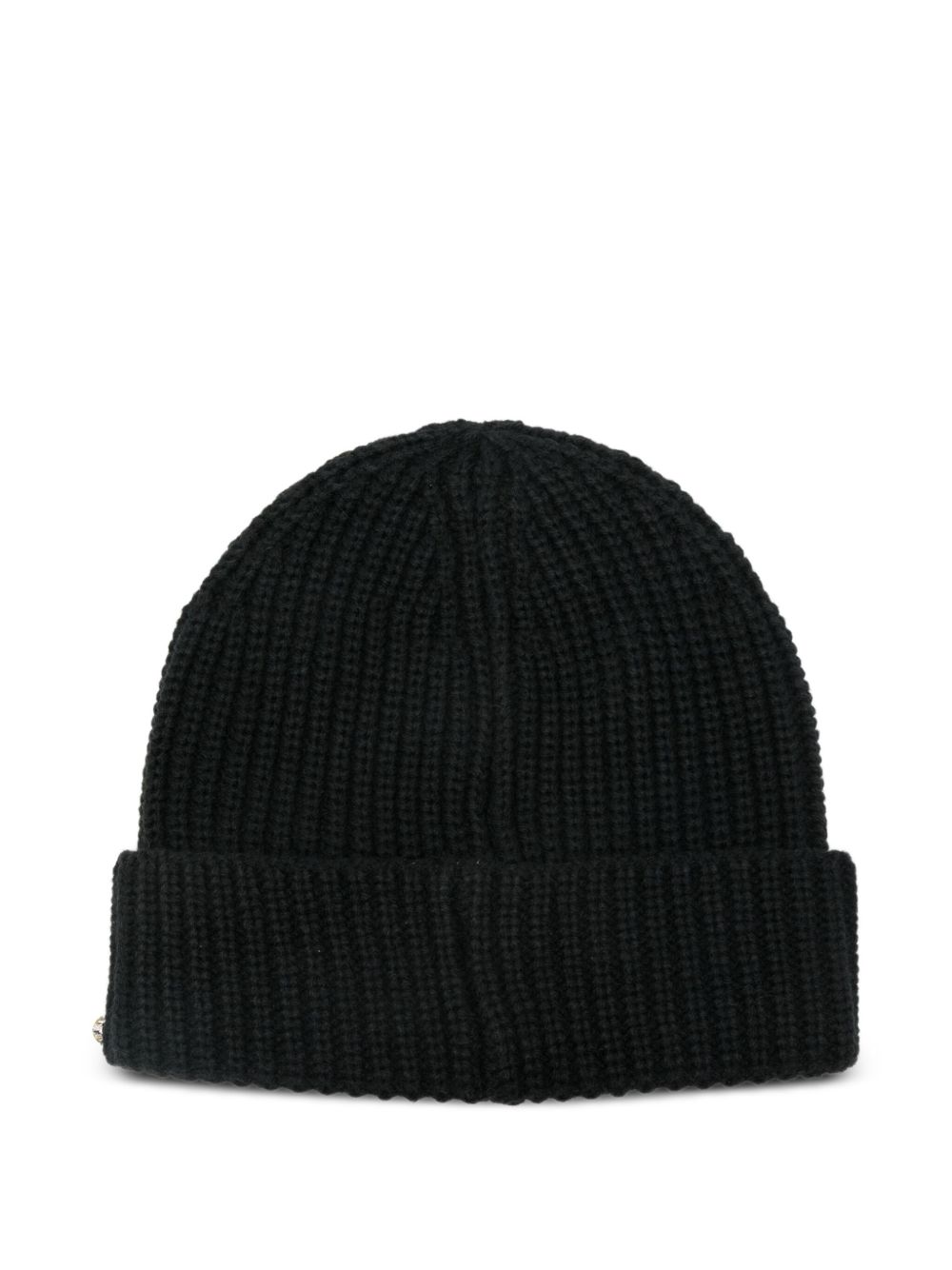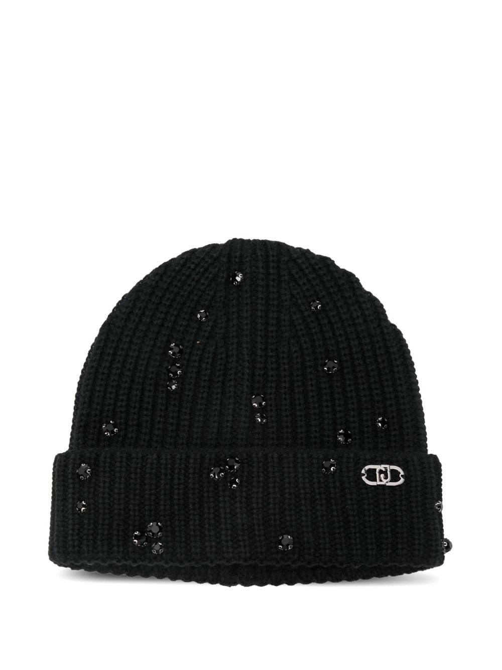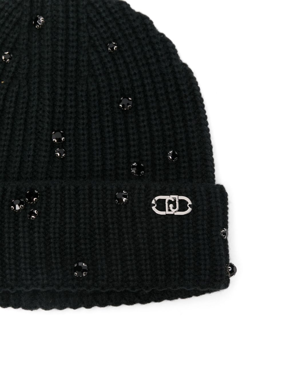 Realizzato in acrilica, trama a coste, applicazione strass e perle, logo davanti in metallo, 100% acrilica