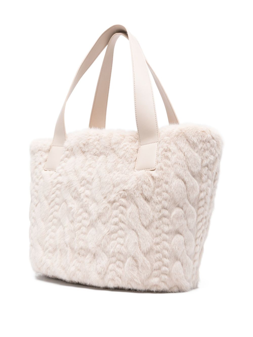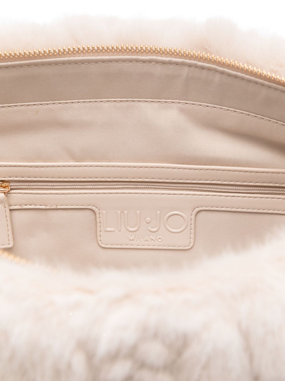 realizzata in ecopelliccia, charm logato in metallo color oro, dettaglio scritta logo impressa davanti, doppio manico, tasca interna con zip, chiusura superiore con cerniera, 50 x 15 x 30 cm.