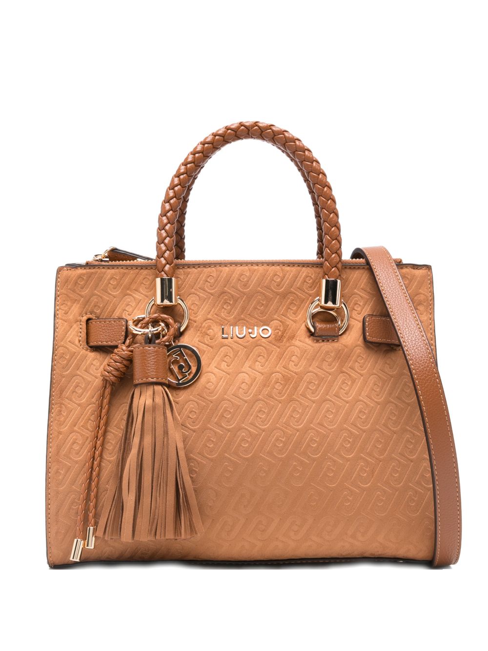 Realizzata in poliestere, motivo con monogramma, doppio manico intrecciato fisso, chiusura superiore scomparto centrale con bottone magnetico, chiusura dei due scomparti superiori con zip, dettaglio nappina e logo in metallo color oro davanti, profondità 12 cm, altezza 20 cm, larghezza 27 cm, 100% poliestere