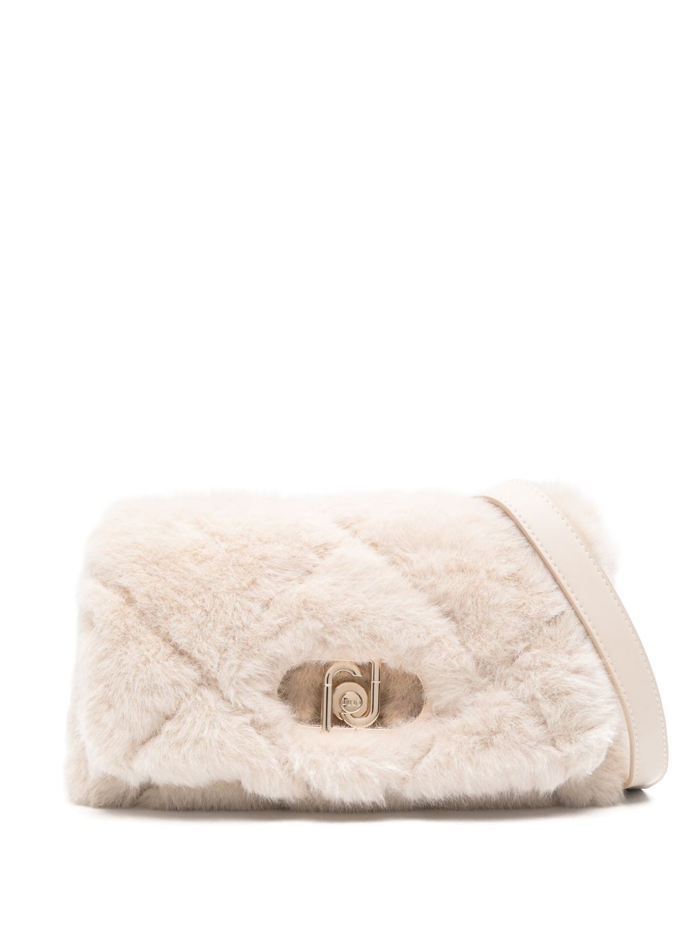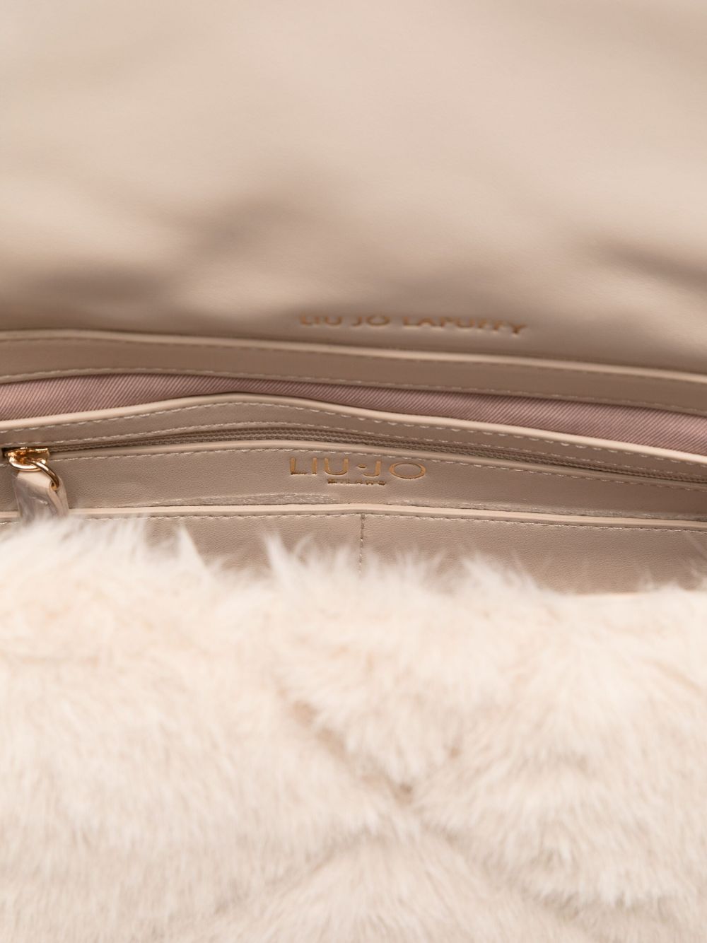 realizzata in ecopelliccia trapuntata, logo in metallo sul davanti, doppio manico removibile, tasca interna con zip, chiusura superiore con pattina, lunghezza 28 cm, altezza 16 cm, profondità 8 cm