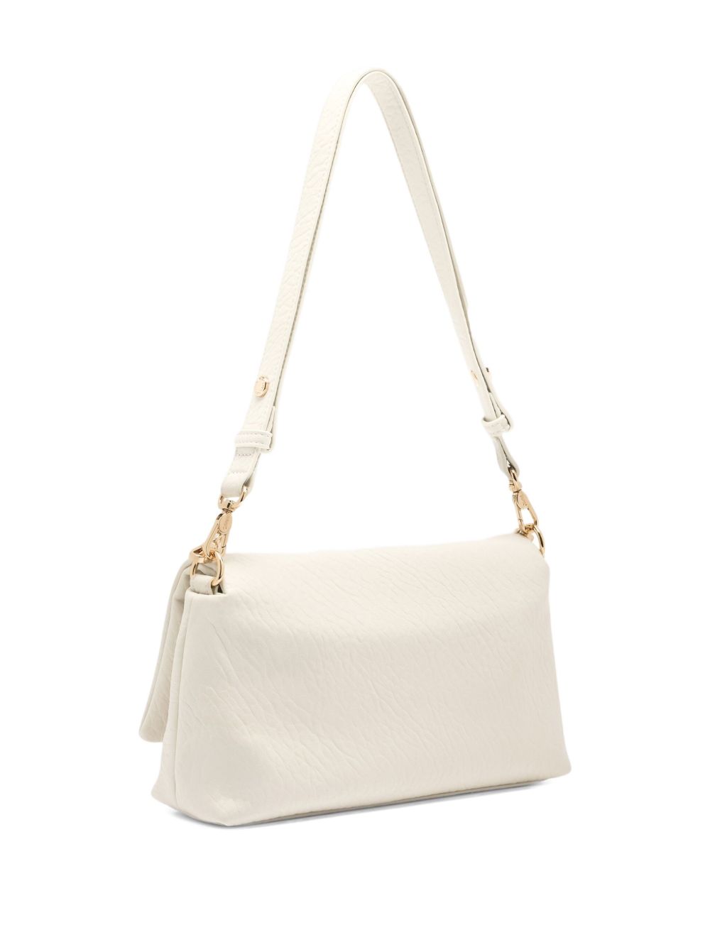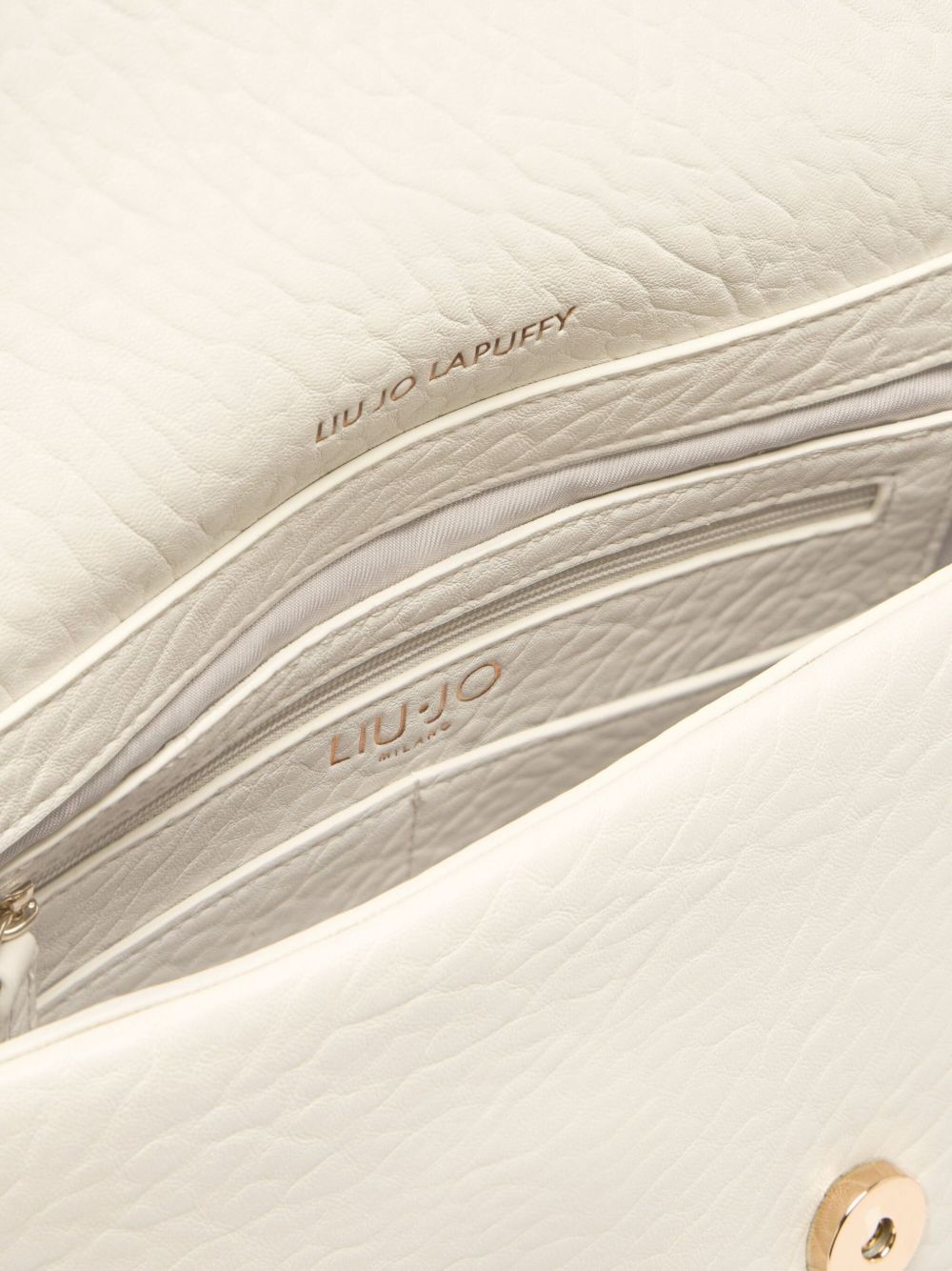 Realizzata in ecopelle, logo davanti in metallo color oro, manico in catena removibile, tracolla regolabile e removibile, 28 x 8 x 16 cm