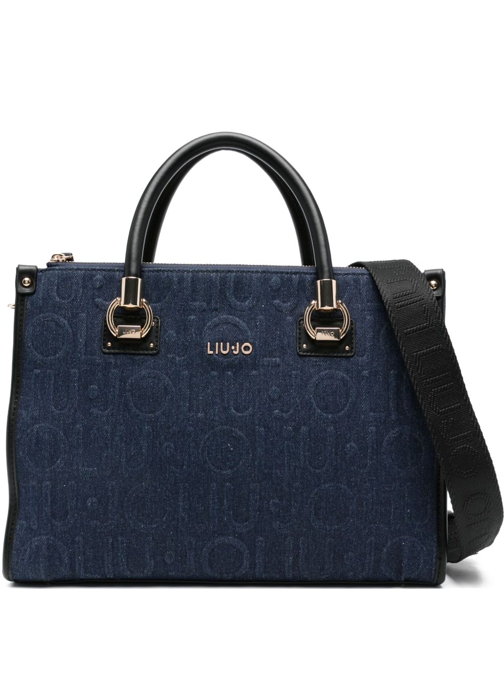 realizzata in denim di misto cotone con lo in rilievo all over, scritta metallica color oro applicata sul davanti, tracolla regolabile e removibile, due scomparti interni chiusi da zip, chiusura superiore con zip, lunghezza 34 cm, altezza 26 cm, profondità 15 cm, 70% cotone, 30% poliestere, fodera 100% poliestere