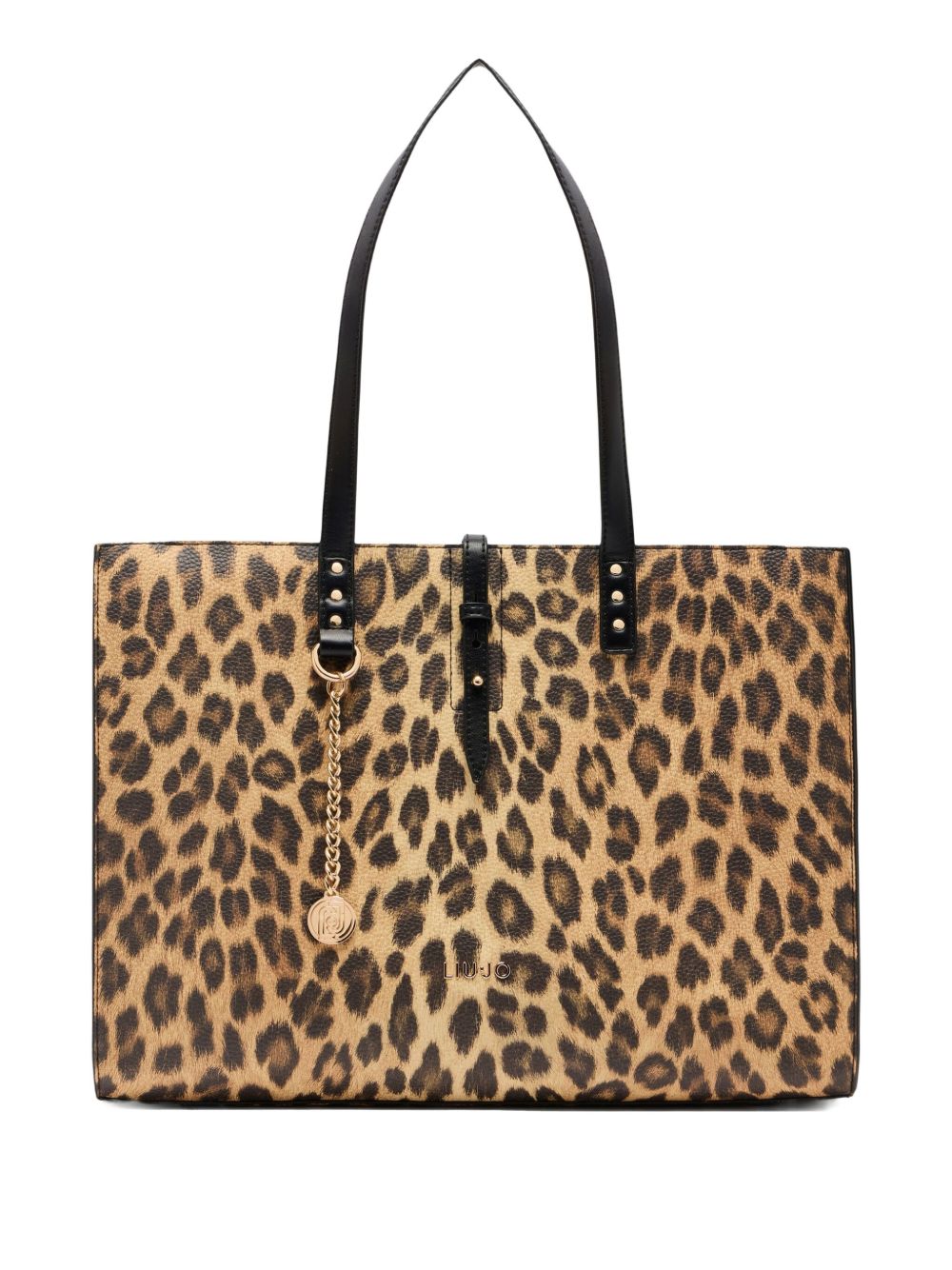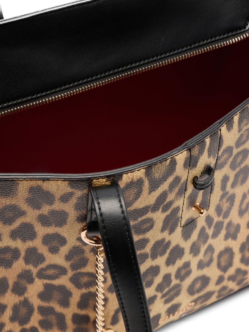 realizzata in ecopelle a stampa animalier, dettaglio con charm, doppio manico, tracolla regolabile e removibile, chiusura superiore con zip e cinturino, lunghezza 40 cm, altezza 29 cm, profondità 15 cm, 100% poliestere