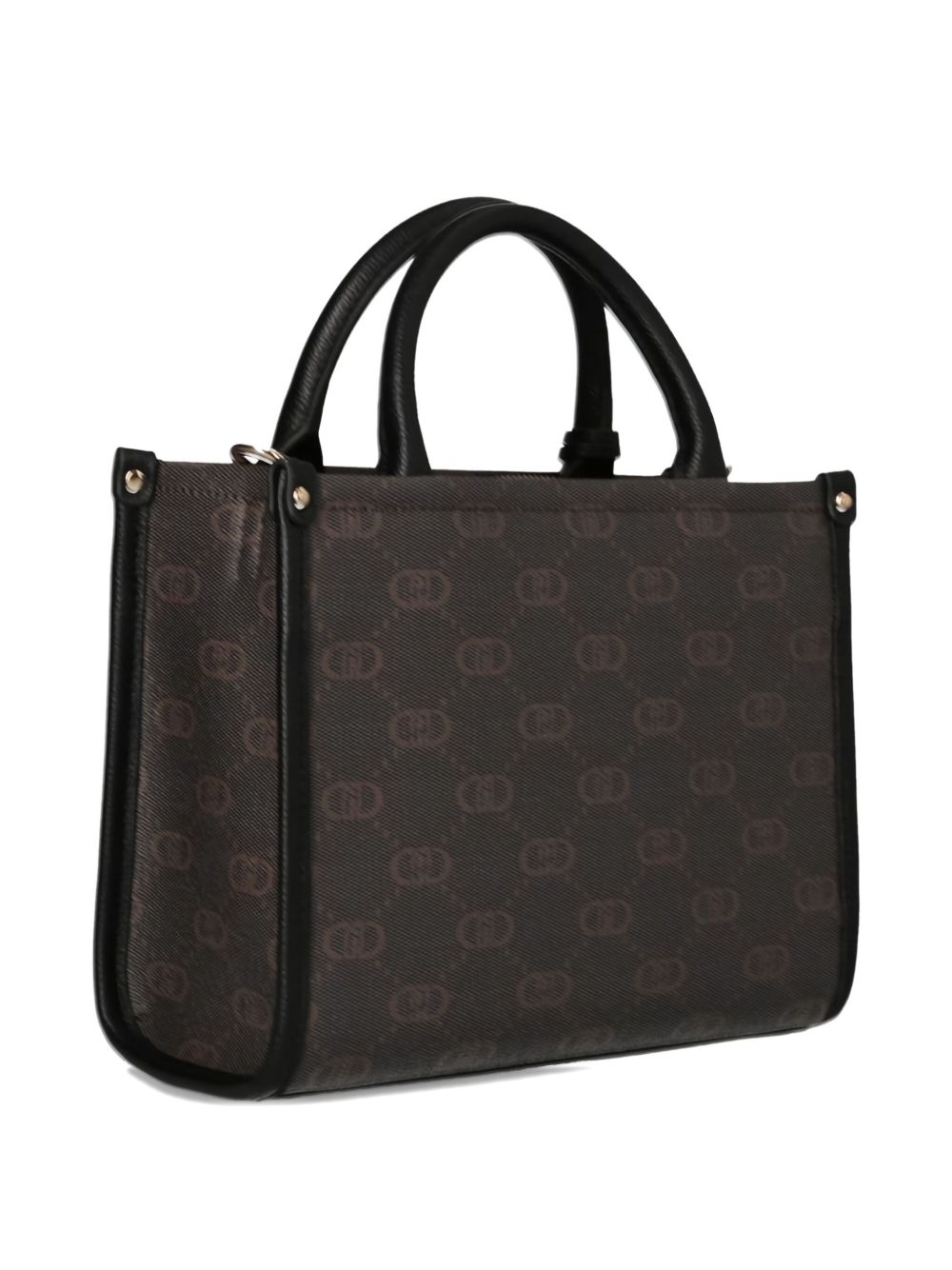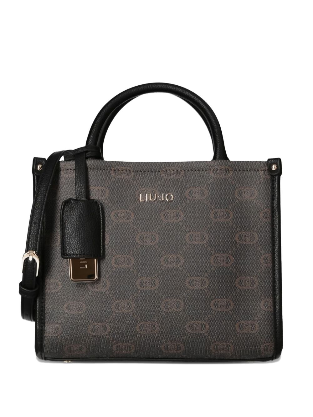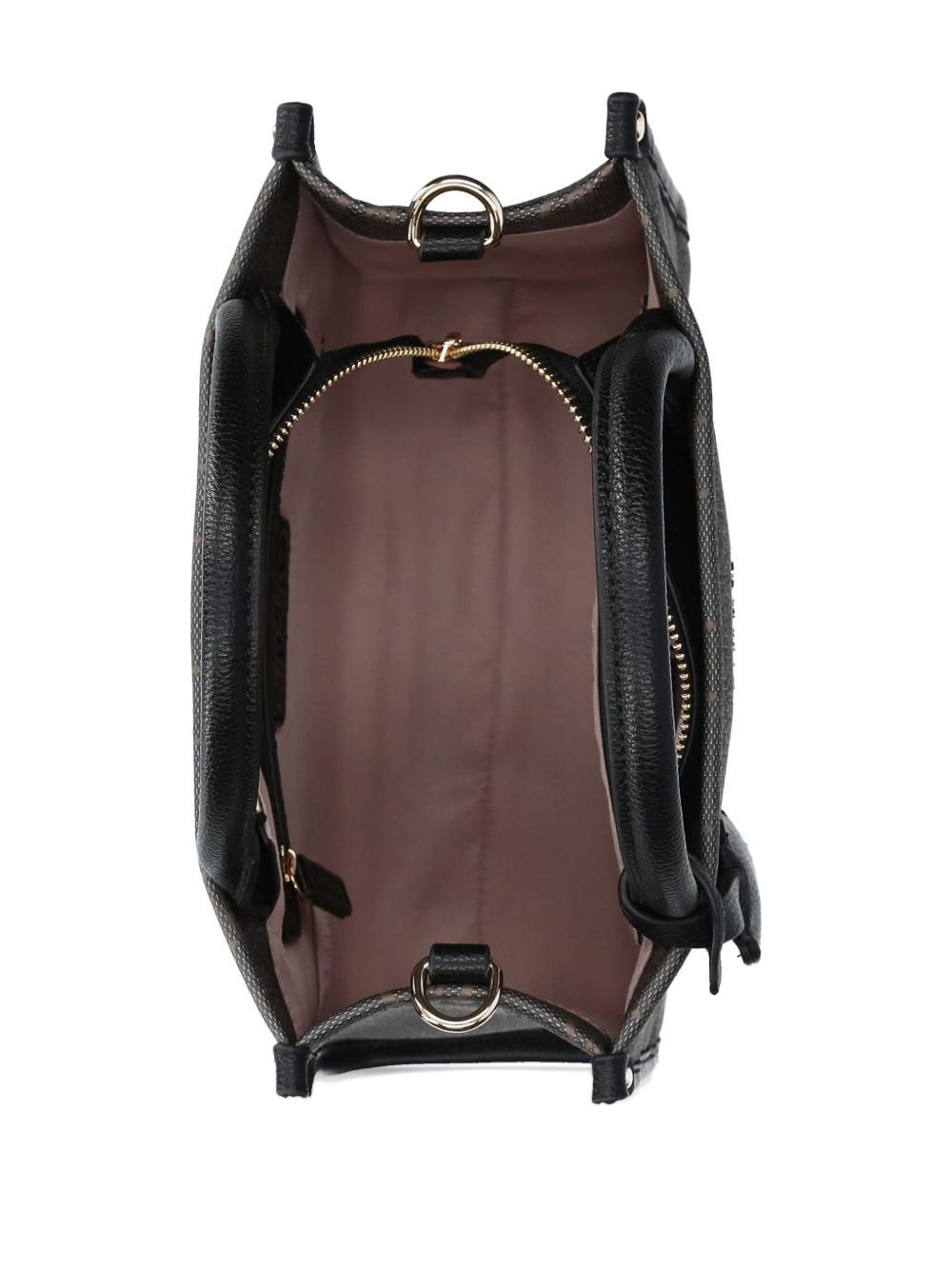 realizzata poliuretano, design con pattern logo, applicazione logo in metallo color oro davanti, tracolla regolabile e removibile, doppio manico, dettagli in metallo color oro, chiusura superiore con cerniera, altezza 20 cm, profondità 11 cm, larghezza 25 cm, 100% poliuretano