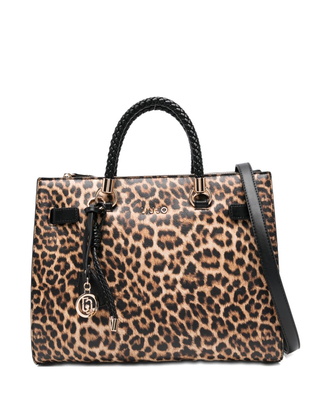 Realizzata in poliestere, stampa animalier, doppio manico superiore, tracolla regolabile e removibile, chiusura superiore scomparto centrale con zip, chiusura superiore dei due scomparti laterali con bottone magnetico, dettaglio ciondolo logato, logo in metallo color oro davanti, profondità 15 cm, altezza 25 cm, larghezza 31 cm,