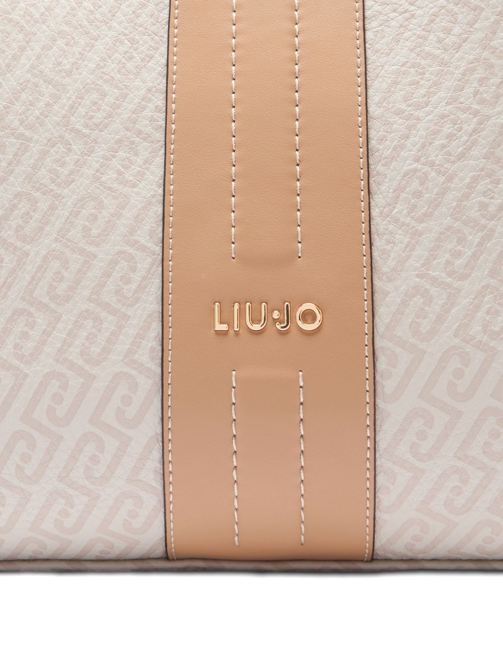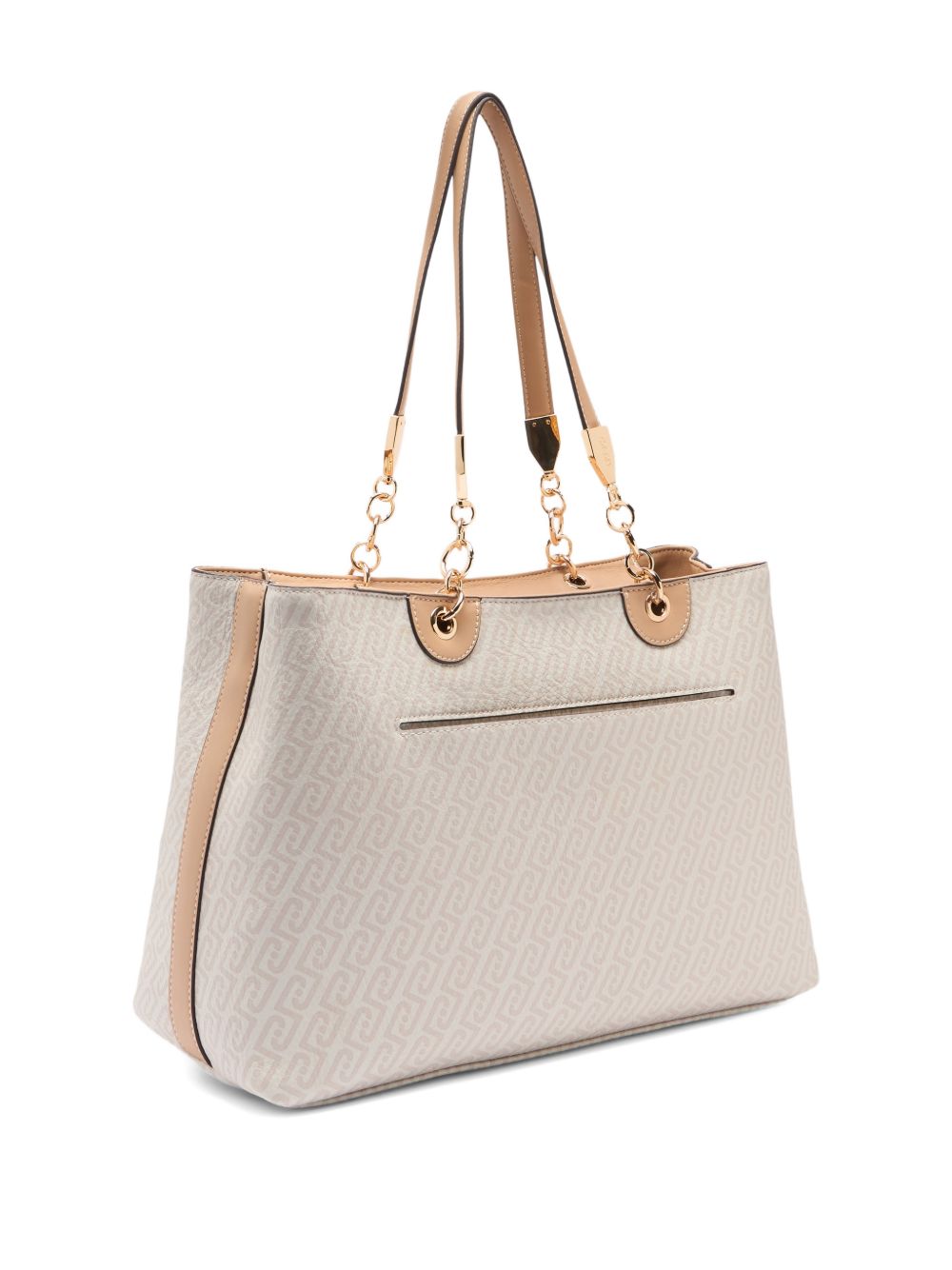 Realizzata in poliestere, stampa effetto martellato con motivo monogram logo, doppio manico superiore con dettaglio a catena, chiusura superiore con zip, tasche interne con cerniera, logo in metallo color oro davanti, profondità 15 cm, altezza 26 cm, larghezza 38 cm.