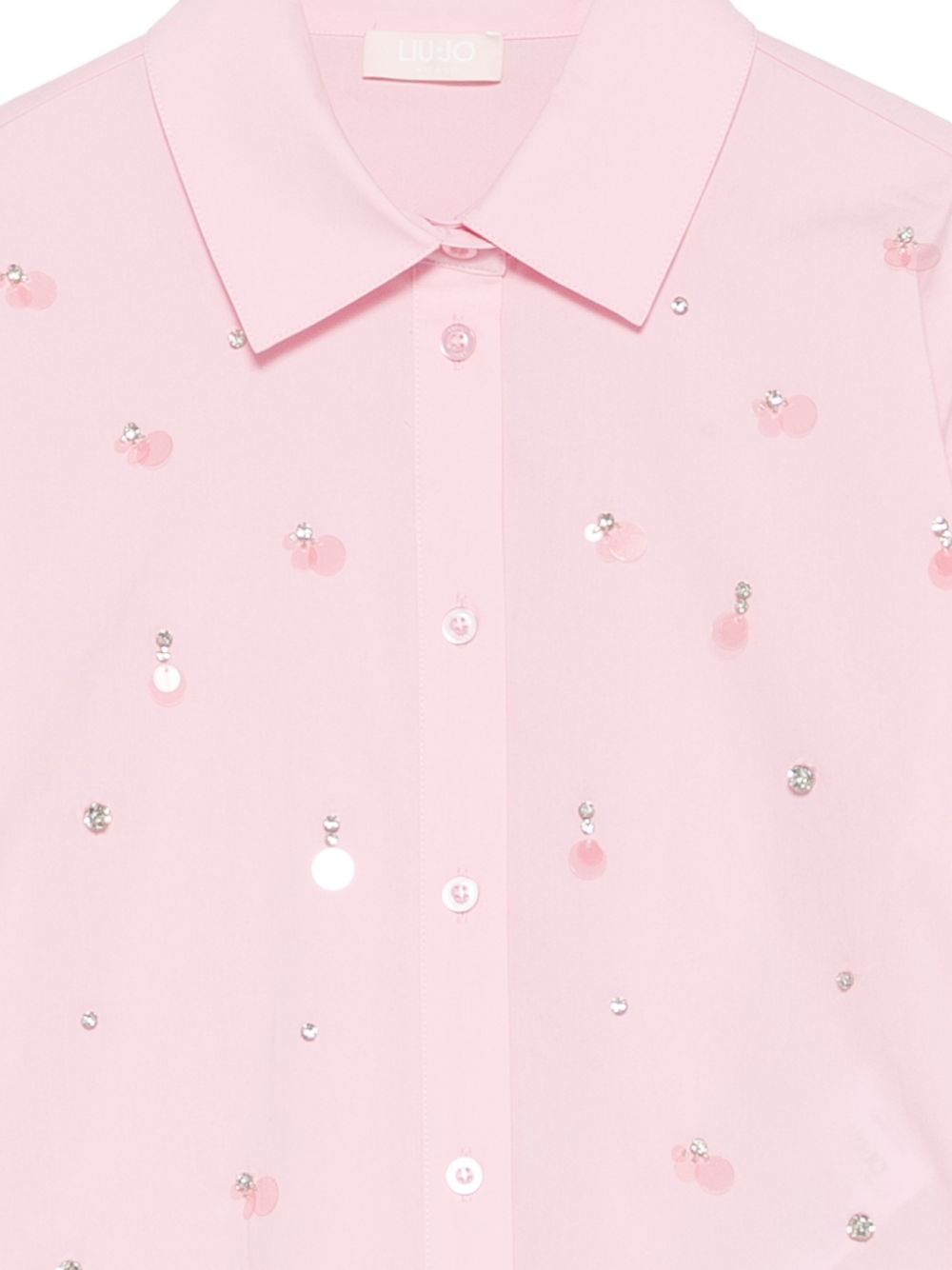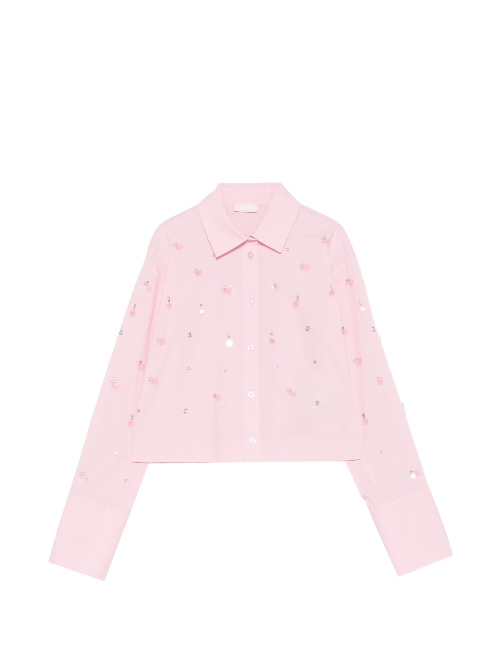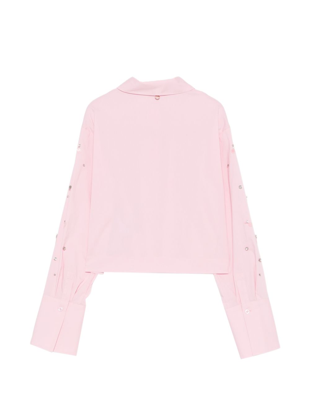 Realizzata in cotone, chiusura con bottoni davanti, colletto classico camicia, decorazioni in gioiello, maniche lunghe, taglio cropped, 70% cotone, 27% poliammide, 3% elastam