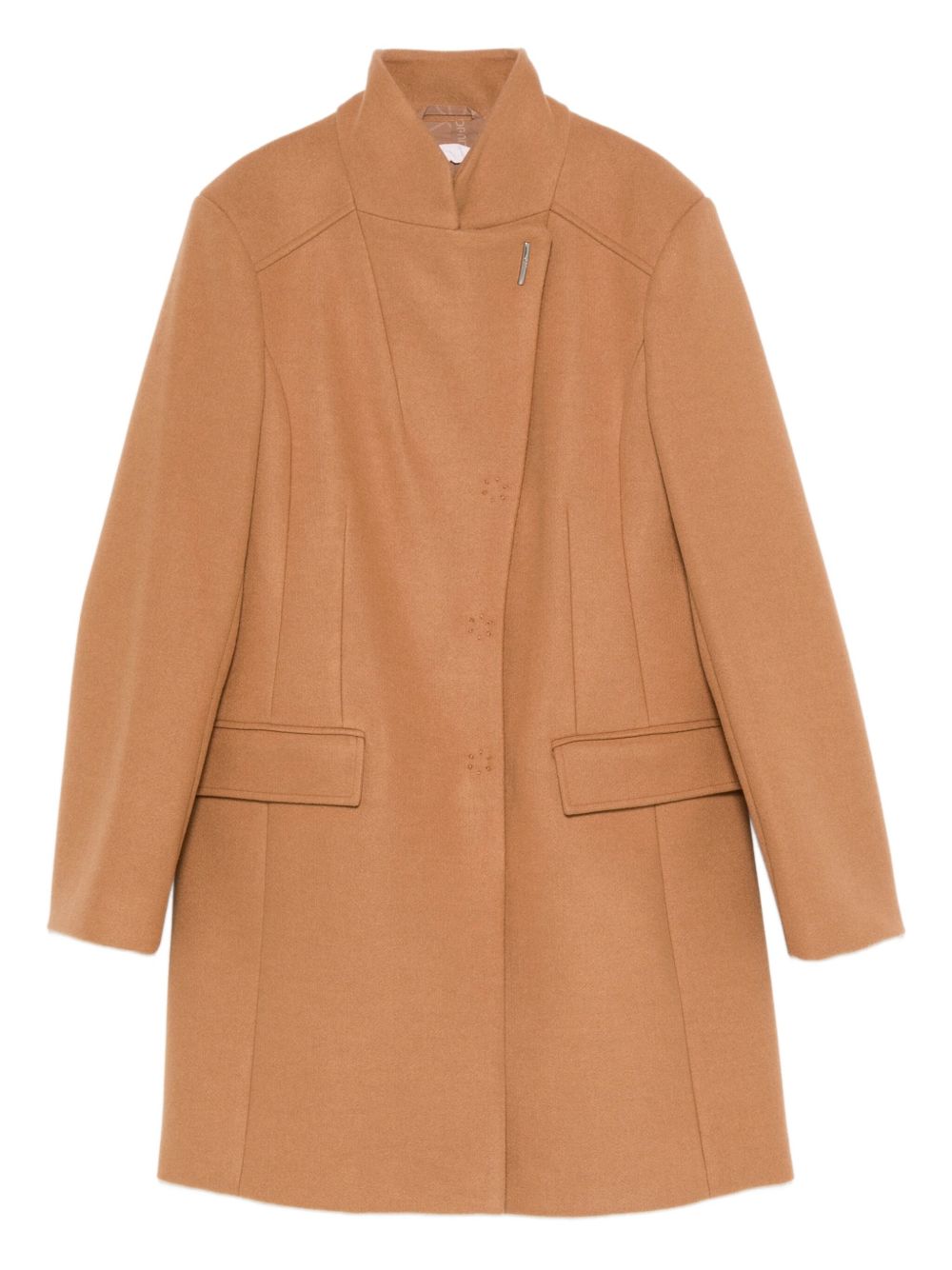 Realizzato in misto poliestere, maniche lunghe, collo alto, chiusura con bottoni nascosta, due tasche laterali a patta.