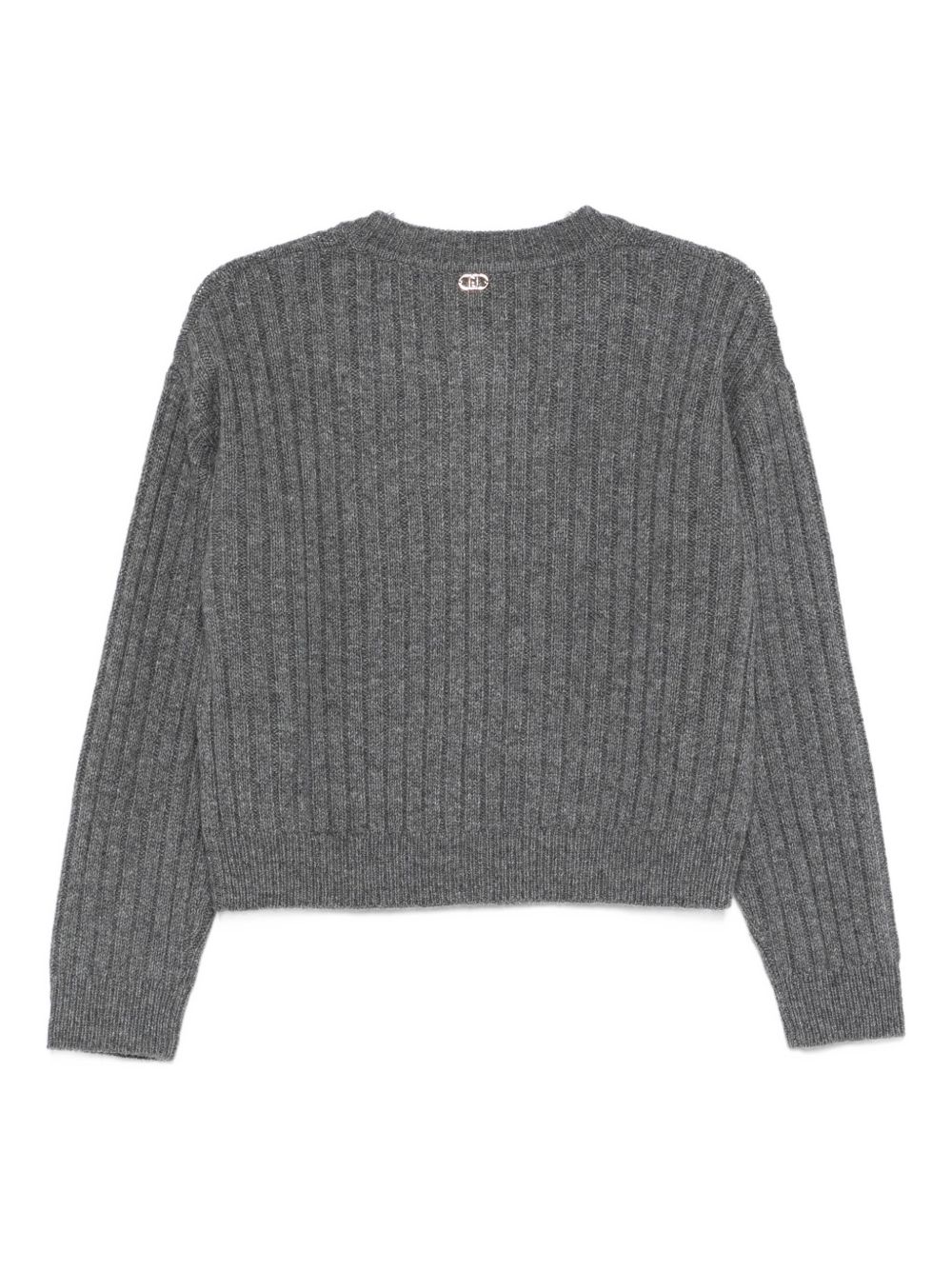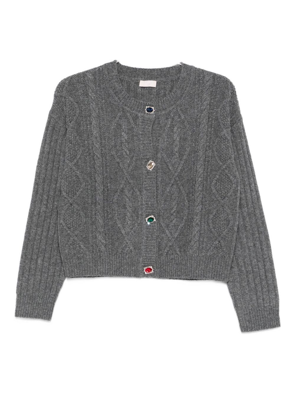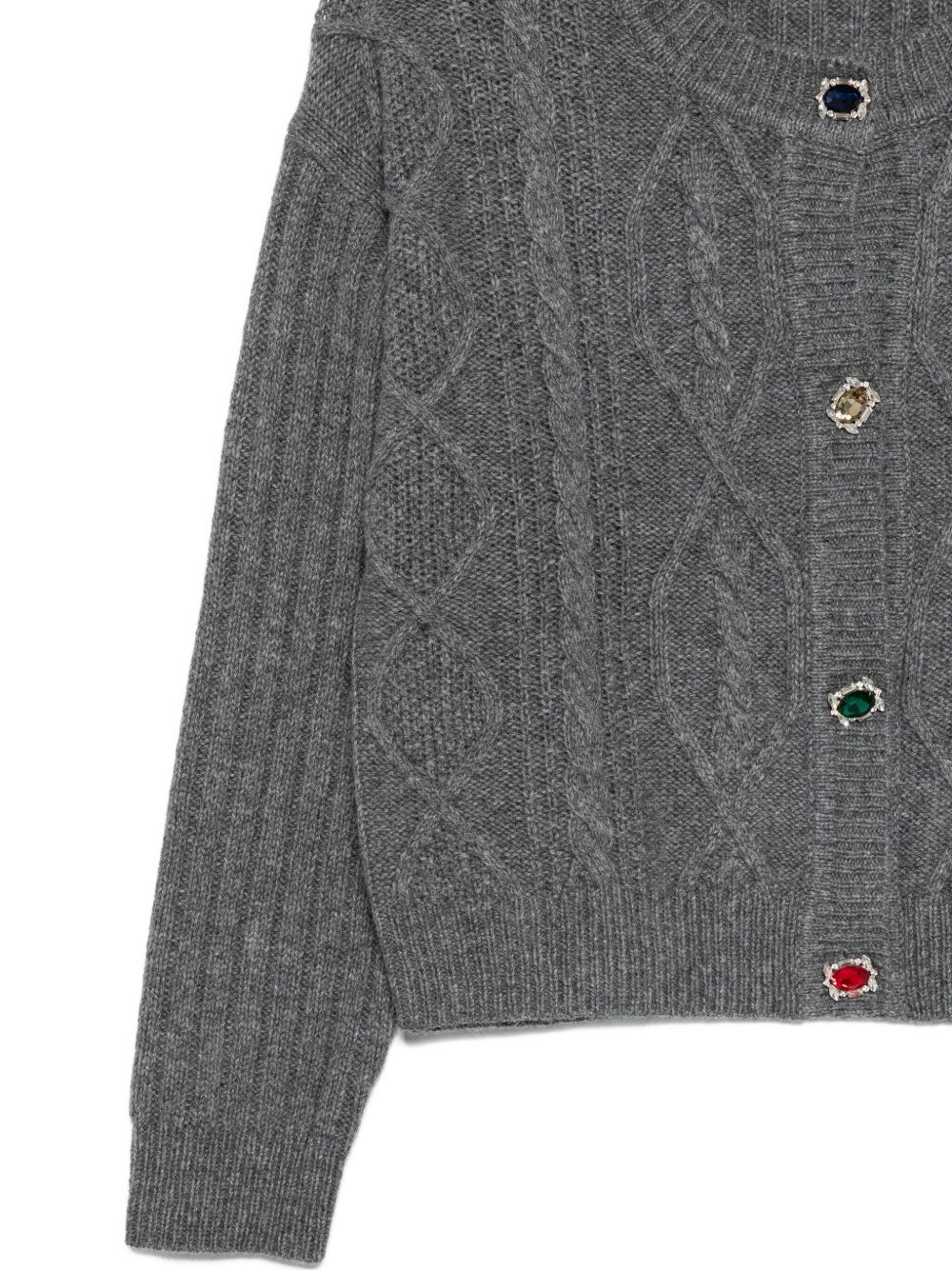 Realizzato in misto lana, lavorazione in maglia intrecciata, chiusura fronatale con bottoni gioiello, manica lunga, girocollo, logo in metallo dietro, 80% lana, 20% nylon
