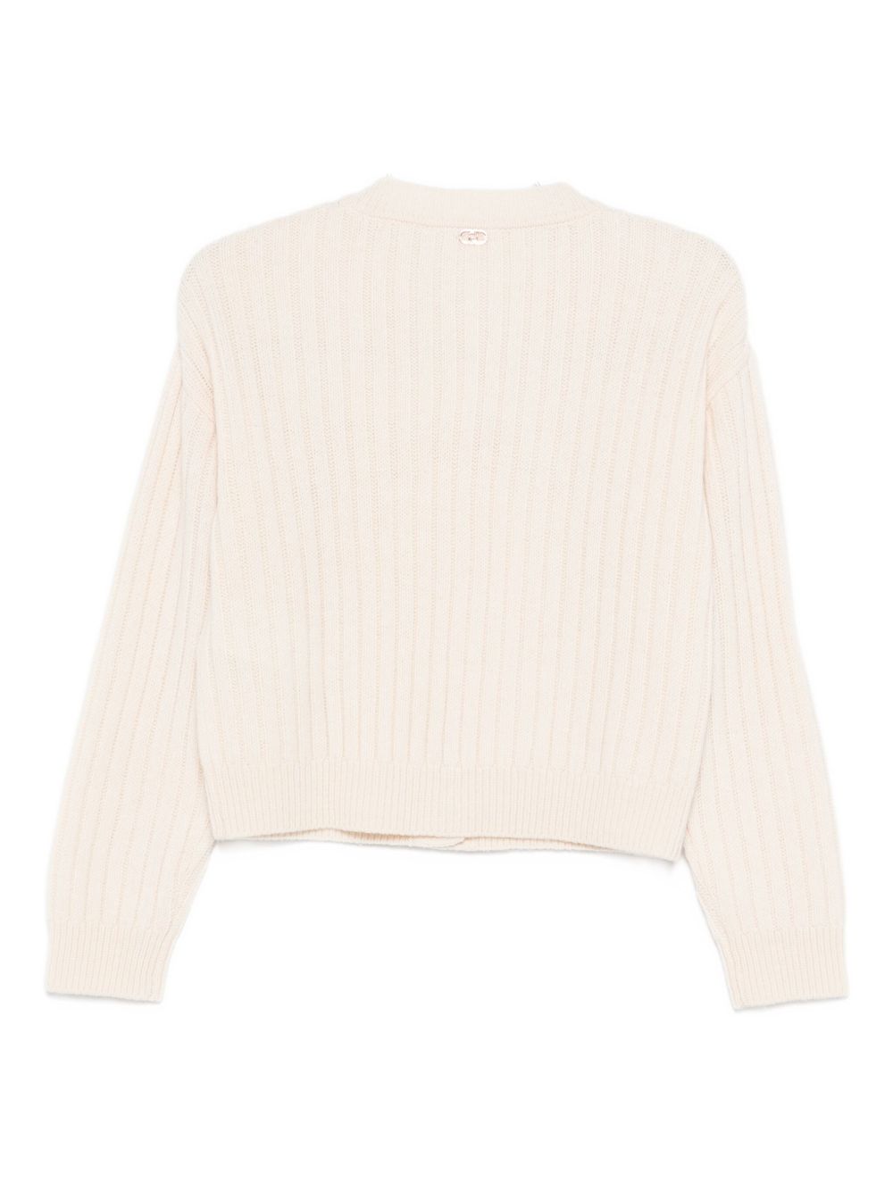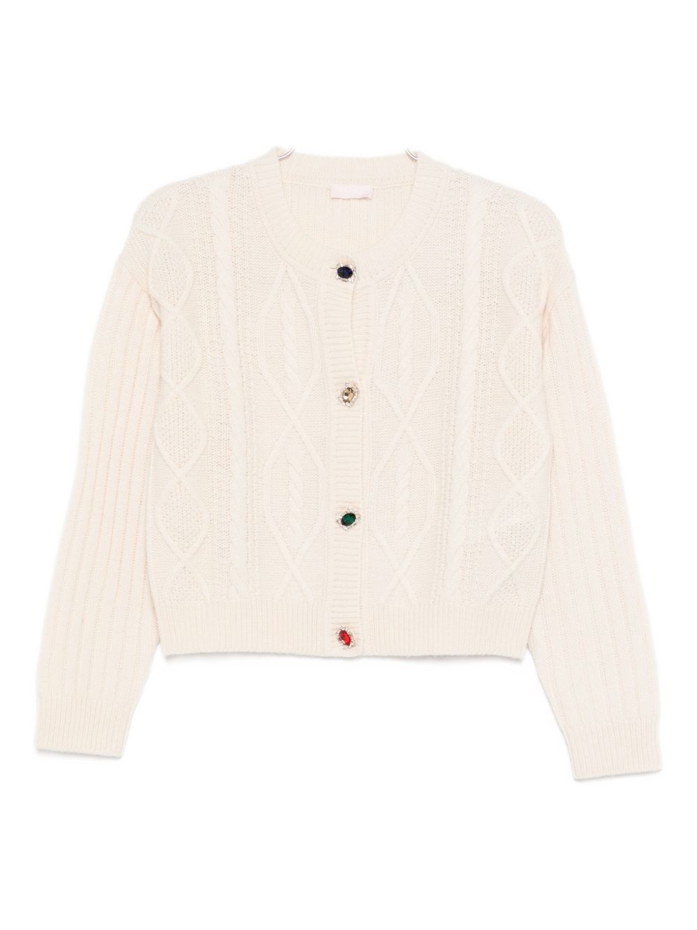 Realizzato in misto lana, lavorazione in maglia intrecciata, chiusura fronatale con bottoni gioiello, manica lunga, girocollo, logo in metallo dietro, 80% lana, 20% nylon