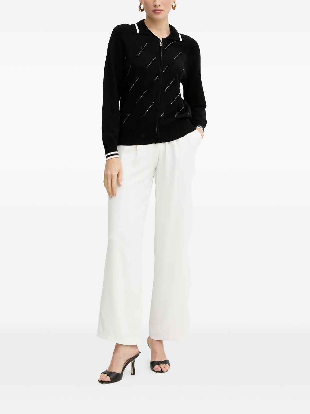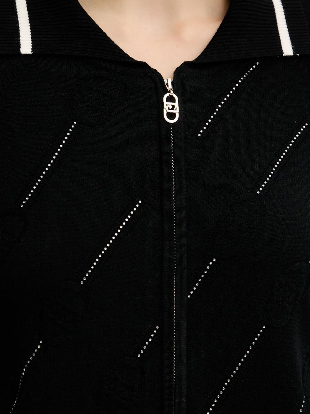 Realizzato in maglia di misto viscosa, polsini e colletto con motivo a righe a contrasto, chiusura frontale con tirazip logata, maniche lunghe, dettaglio logo monogram e strass, bordi e fondo a costine, 62% viscosa, 38% poliestere