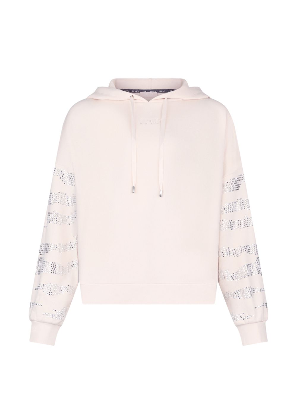 Realizzata in misto cotone, applicazione strass sulle maniche, cappuccio regolabile con coulisse, logo ricamato davanti centrale, 65% cotone, 35% poliestere