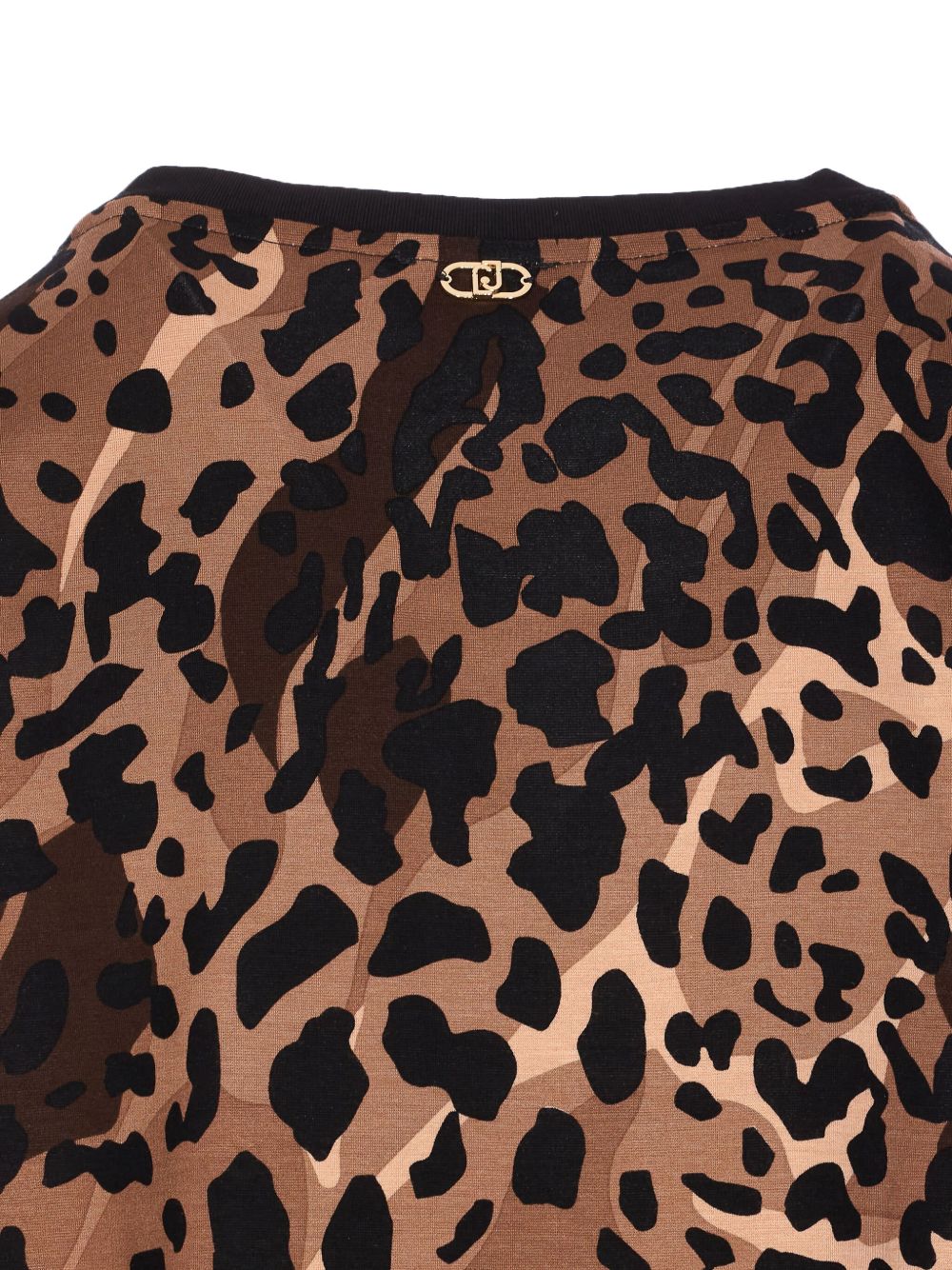Realizzata in misto viscosa stretch, scollo rotondo, stampa animalier, logo in metallo dietro, tasche con patta e bottone.