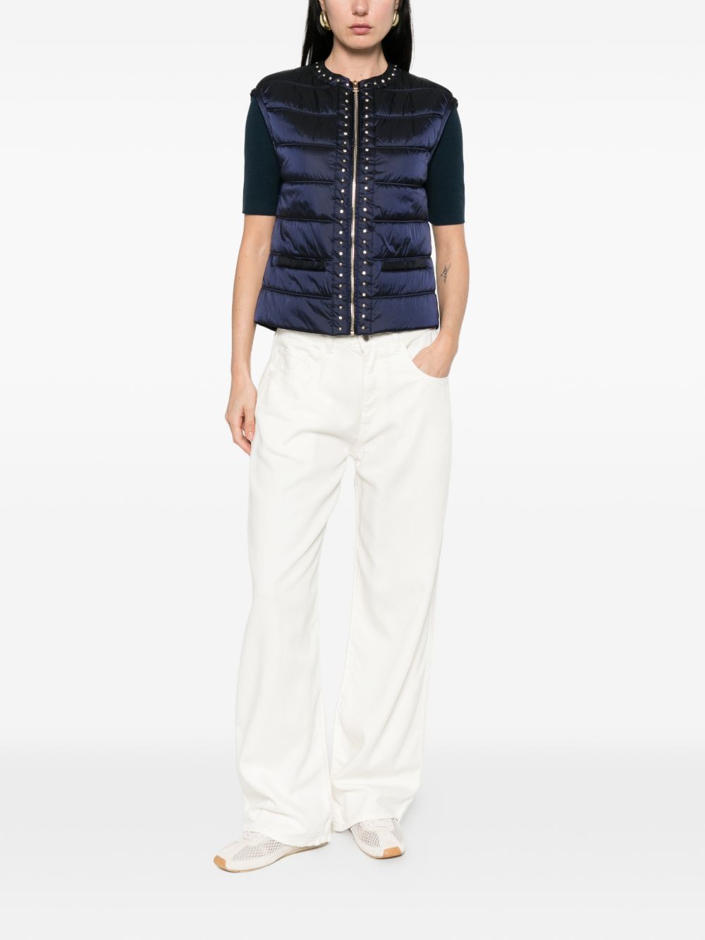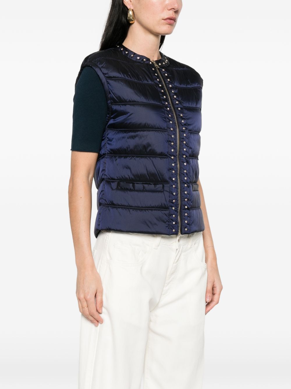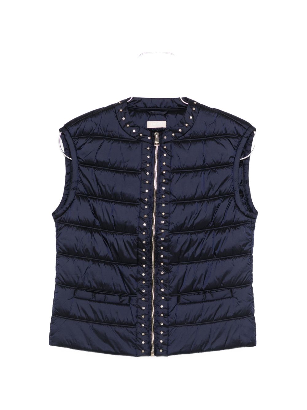 Realizzato in poliestere, chiusura frontale con zip, girocollo, due tasche a filetto davanti, applicazione gioielli lungo la cerniera e sul collo, senza maniche, 100% poliestere