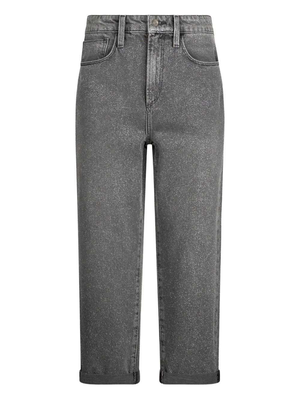realizzato in denim di cotone, glitter all over, lavaggio used, vita alta, gamba dritta, modello a cinque tasche, logo in metallo sul retro, chiusura con bottone e zip coperta, 100% cotone