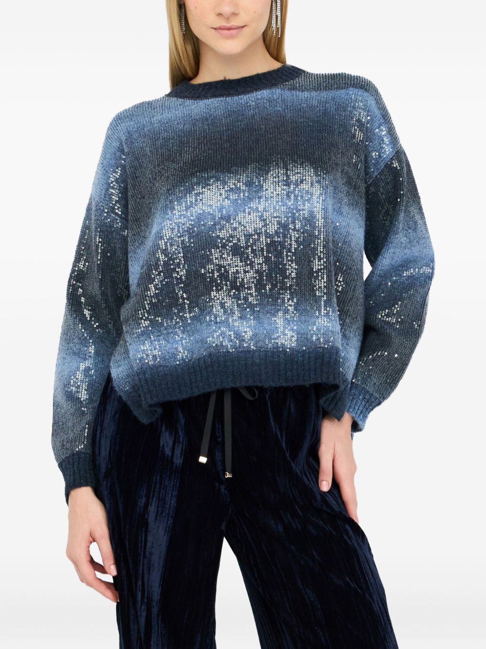 Realizzata in misto poliestere, collo fondo e polsini a coste, manica lunga, girocollo, spacchi laterali, applicazione paillettes, 64% poliestere, 28% acrilico, 8% lana