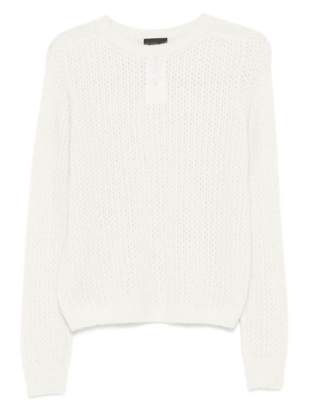 Realizzata in misto alpaca, lavorazione a punto aperto, girocollo, maniche lunghe, 45% alpaca, 32% poliammide, 16% lana, 5% poliestere metalizzato, 2% elastan