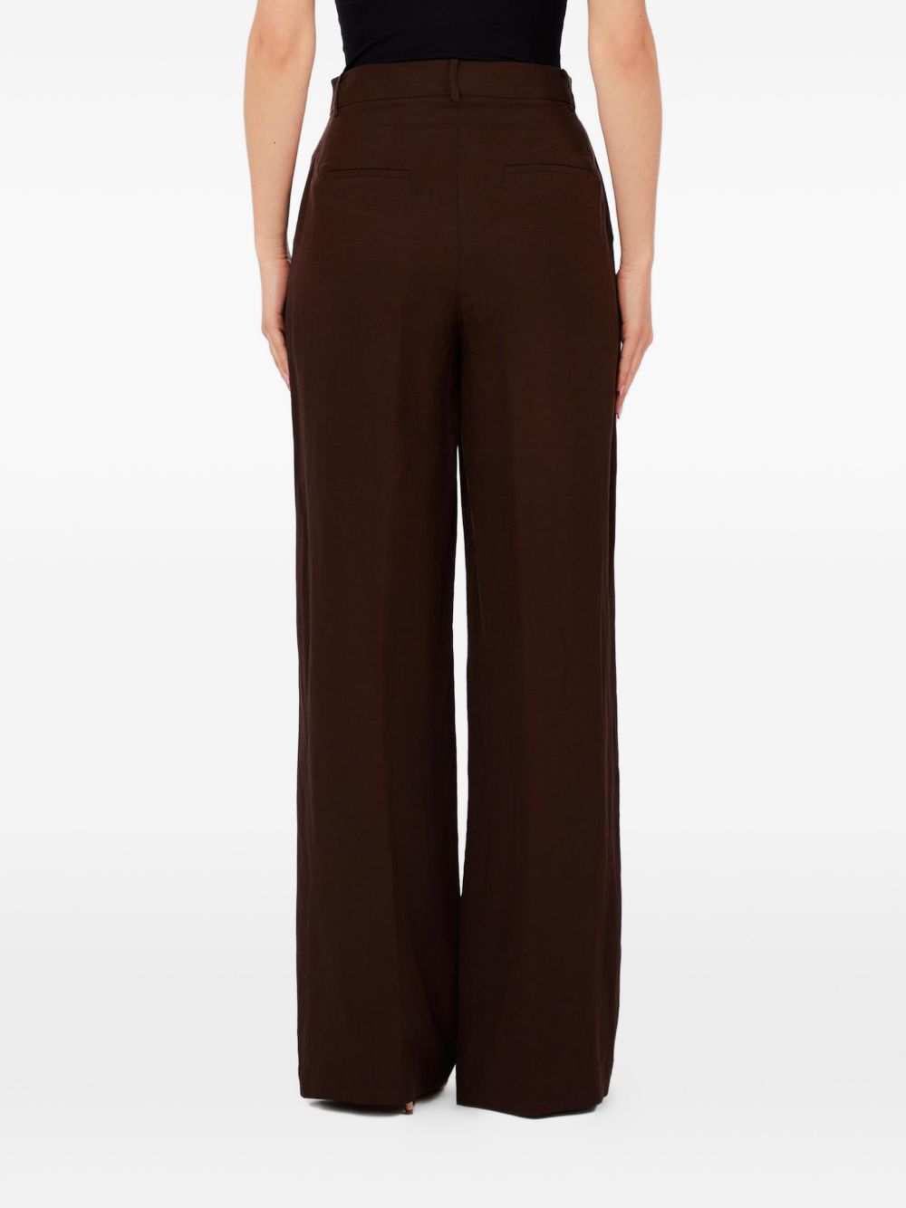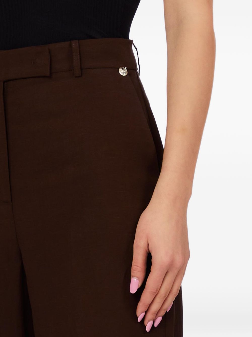 Pantalone Liu Jo da donna modello palazzo in lino marrone, perfetto per la stagione estiva grazie alla leggerezza del tessuto.