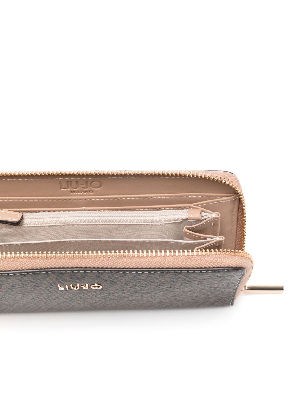 realizzato in ecopelle logata, logo in metallo color oro, chiusura a giro con zip, scomparti per monete banconote e carte, lunghezza 19 cm, altezza 10 cm, profondità 2 cm