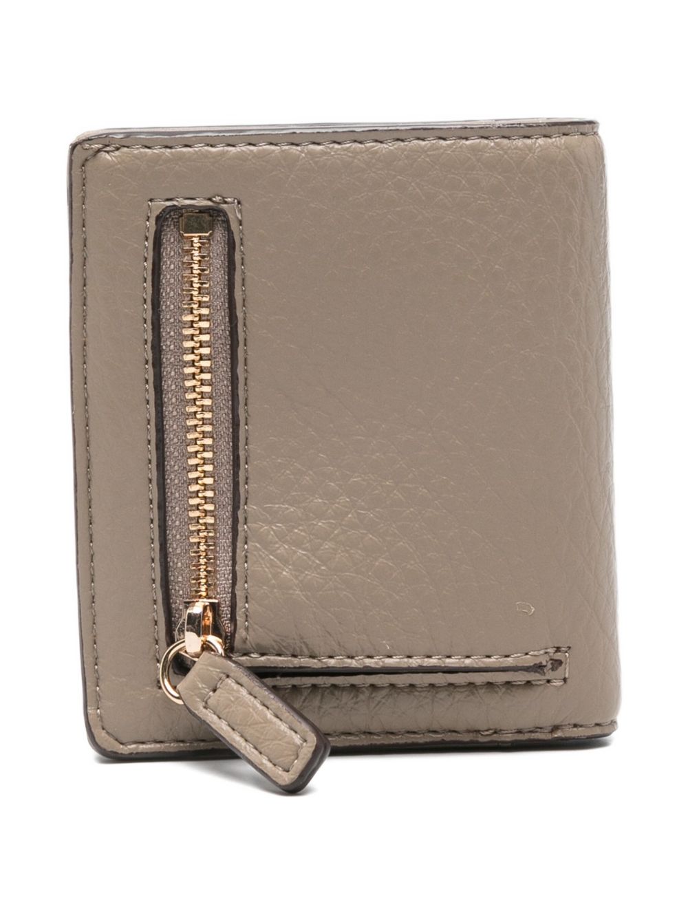 Realizzato in poliuretano con effetto bottolato, logo in metallo color oro davanti, chiusura con bottone, portacarte interno, logo impresso all'interno, tasca portamonete esterna con cerniera, 9 x 3 x 11 cm.