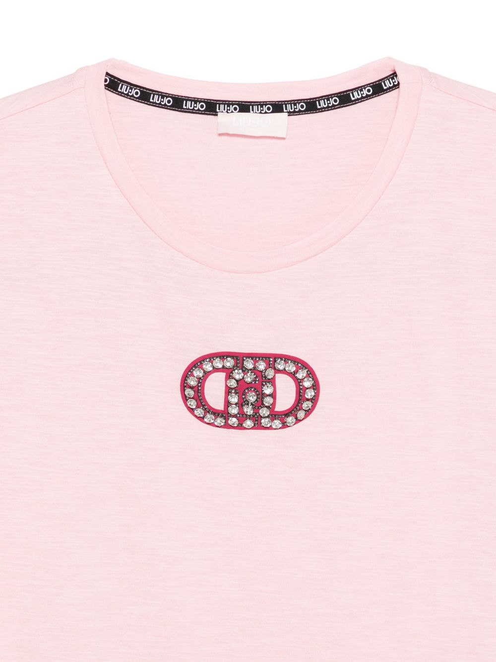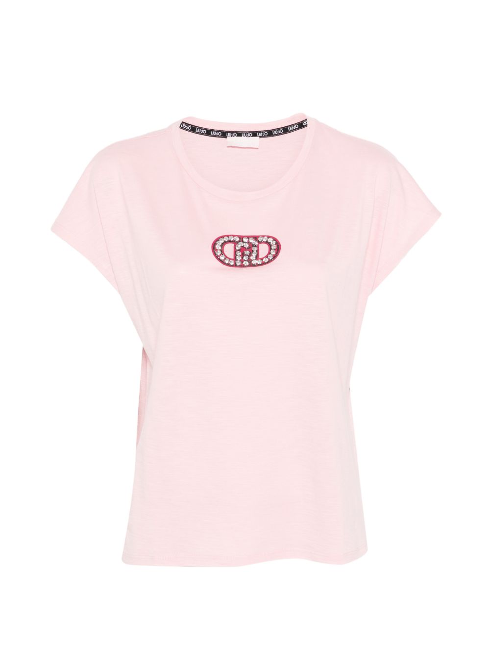 T-shirt Liu Jo da donna rosa con stampa logo arricchita da strass e grafica effetto fiammata, ideale per un look giovane e dinamico.