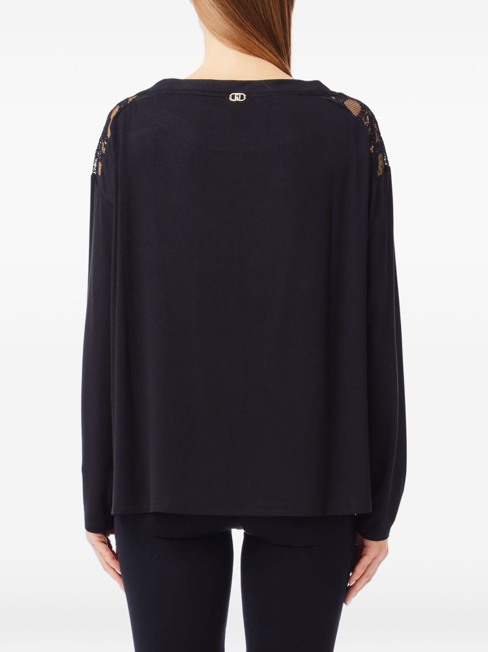 Realizzata in viscosa stretch, scollo a barca, applicazione logo in metallo dietro, dettagli in pizzo.