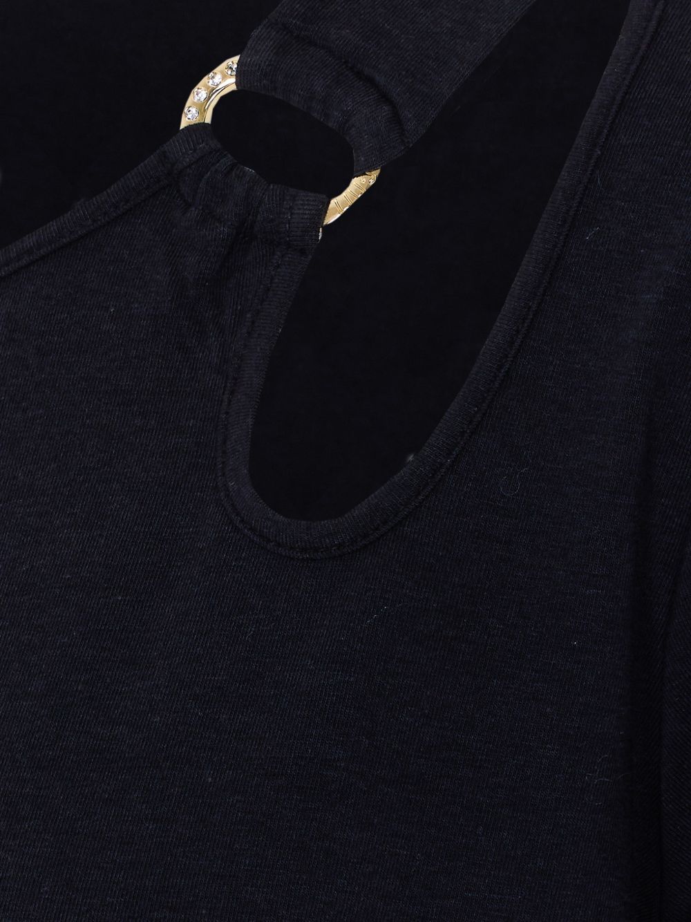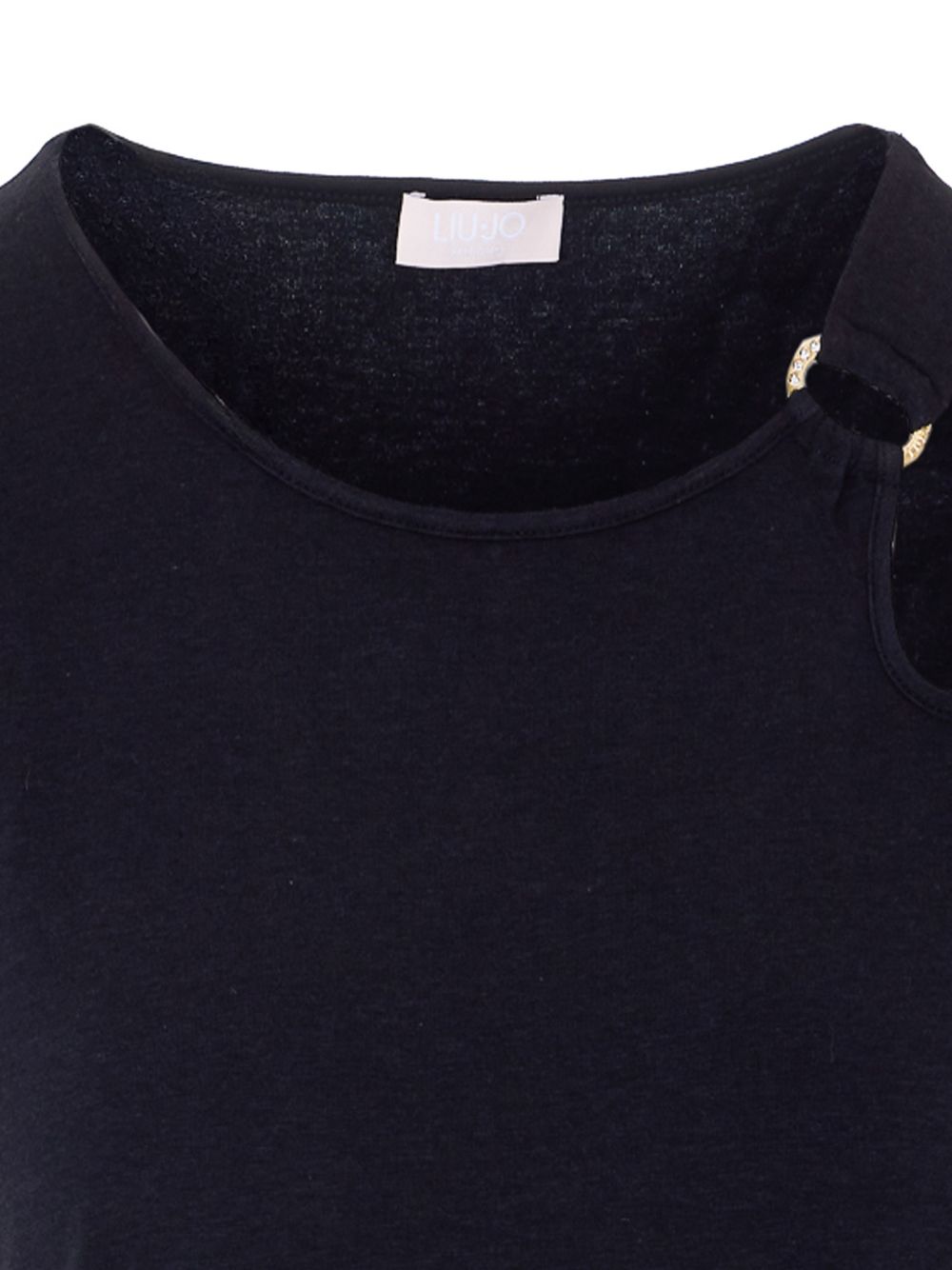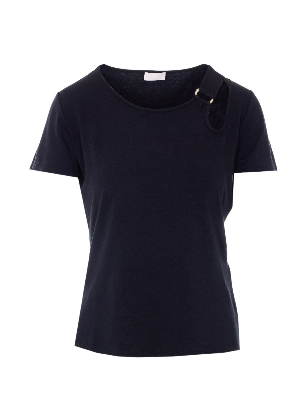 Realizzata in misto bamboo, girocollo, dettaglio anello in metallo color oro sulla spalla, manica corta, 67% bamboo, 28% cotone, 5% elastam