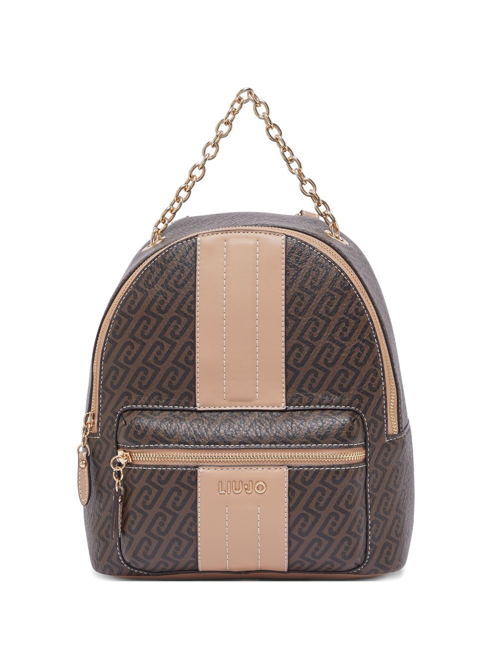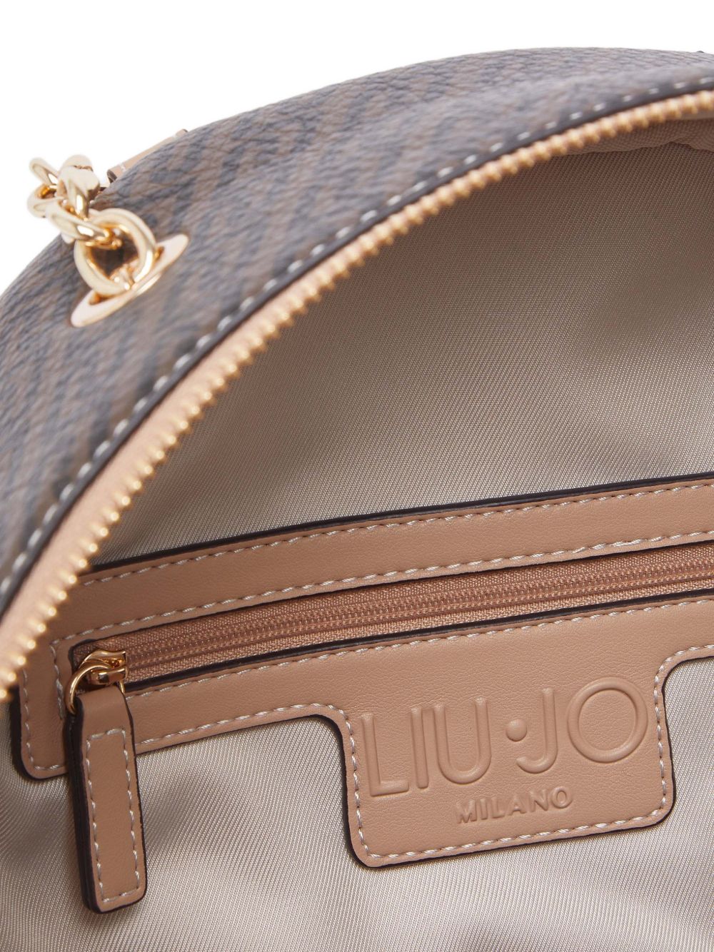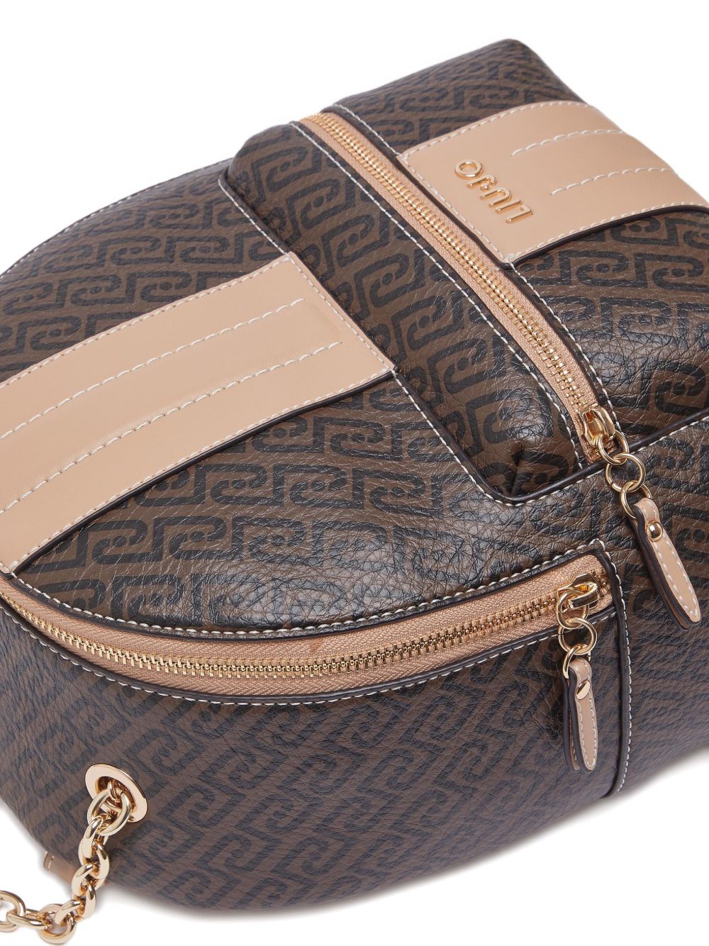 Realizzato in poliestere, chiusura davanti e superiore con zip, spallacci regolabili, tasca interna con cerniera, stampa all-over, logo in metallo color oro davanti, manico superiore a catena, 23 x 12 x 28 cm.