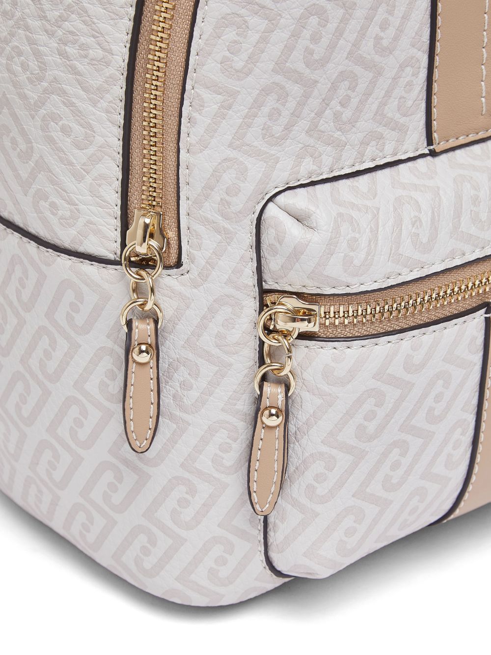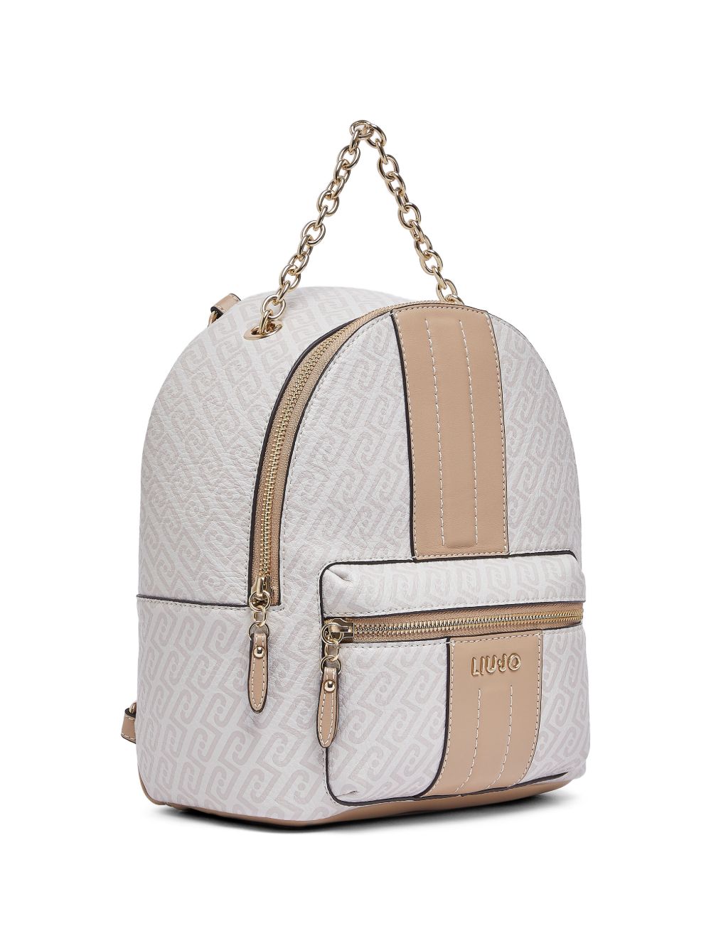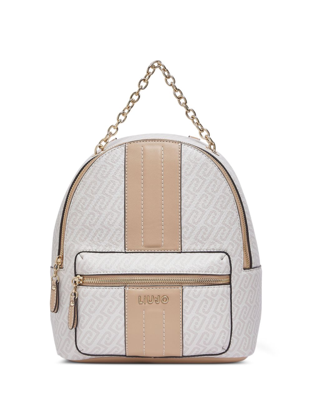 Realizzato in poliestere, chiusura davanti e superiore con zip, spallacci regolabili, tasca interna con cerniera, stampa all-over, logo in metallo color oro davanti, manico superiore a catena, 23 x 12 x 28 cm.