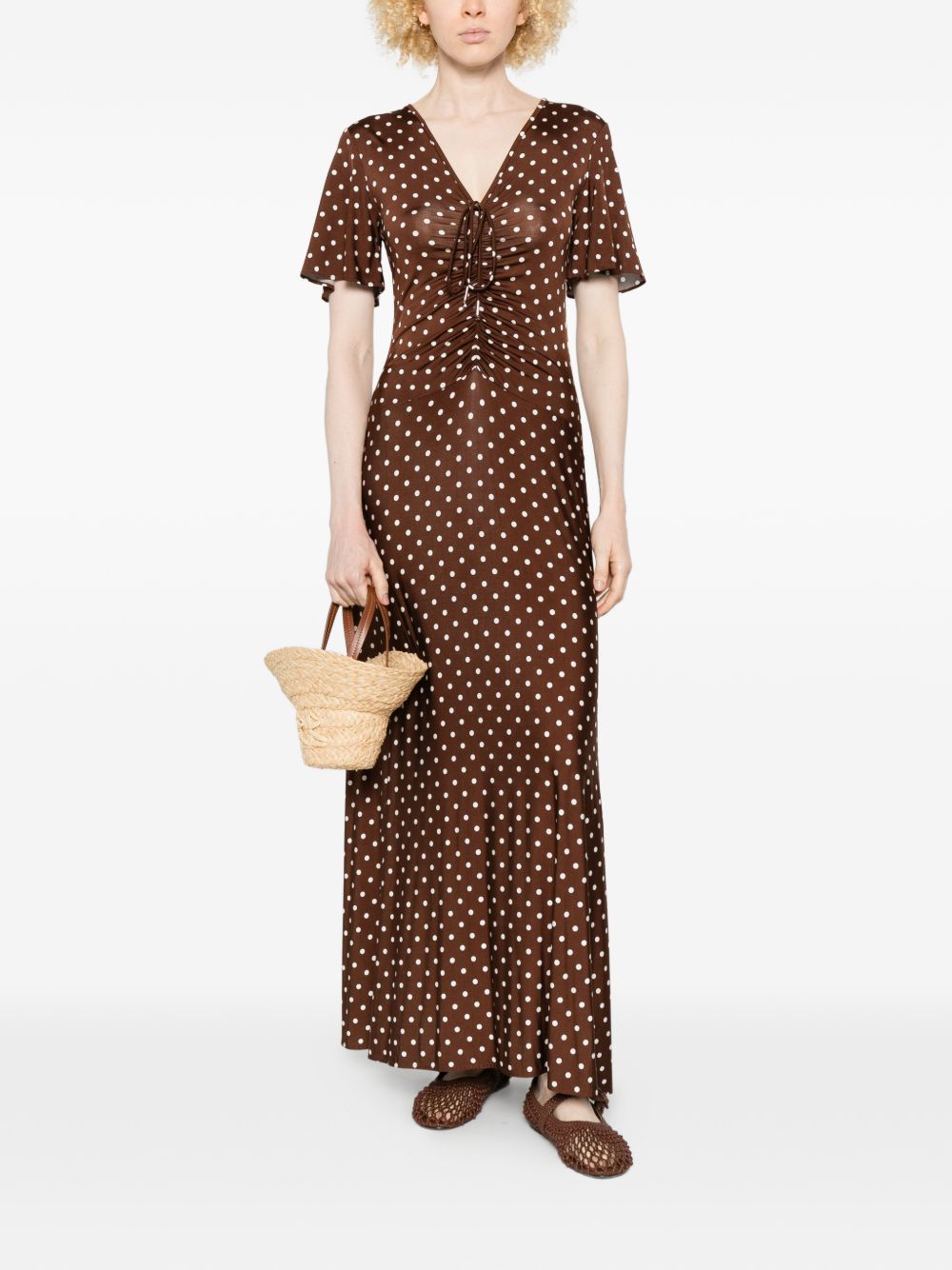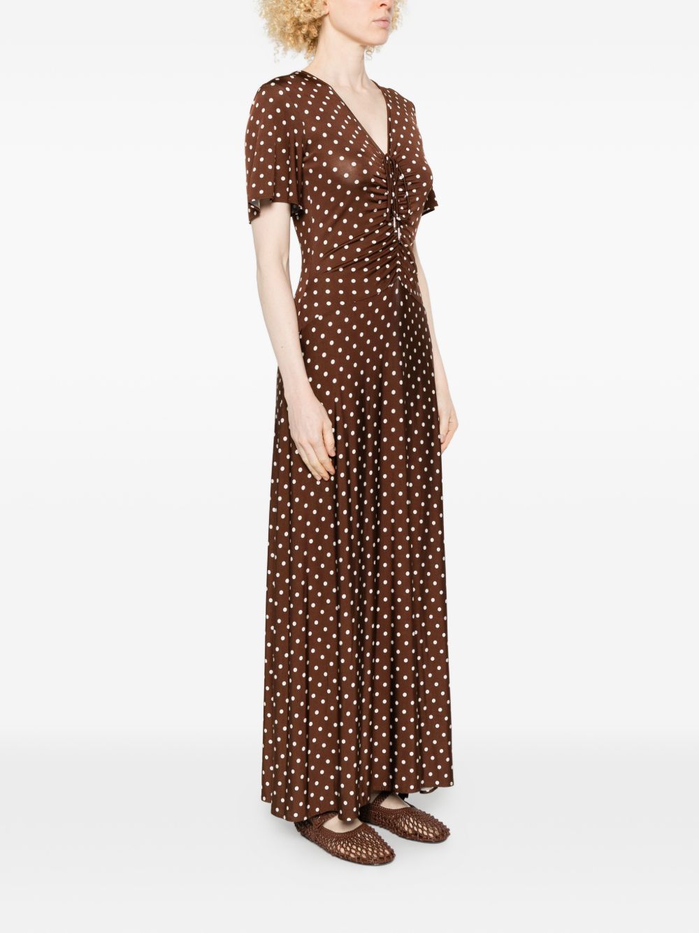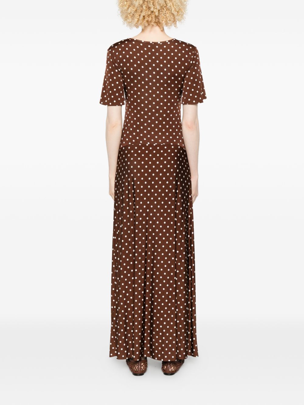 Abito lungo Marella Sport con fantasia a pois su base marrone, caratterizzato da una linea fluida e femminile.