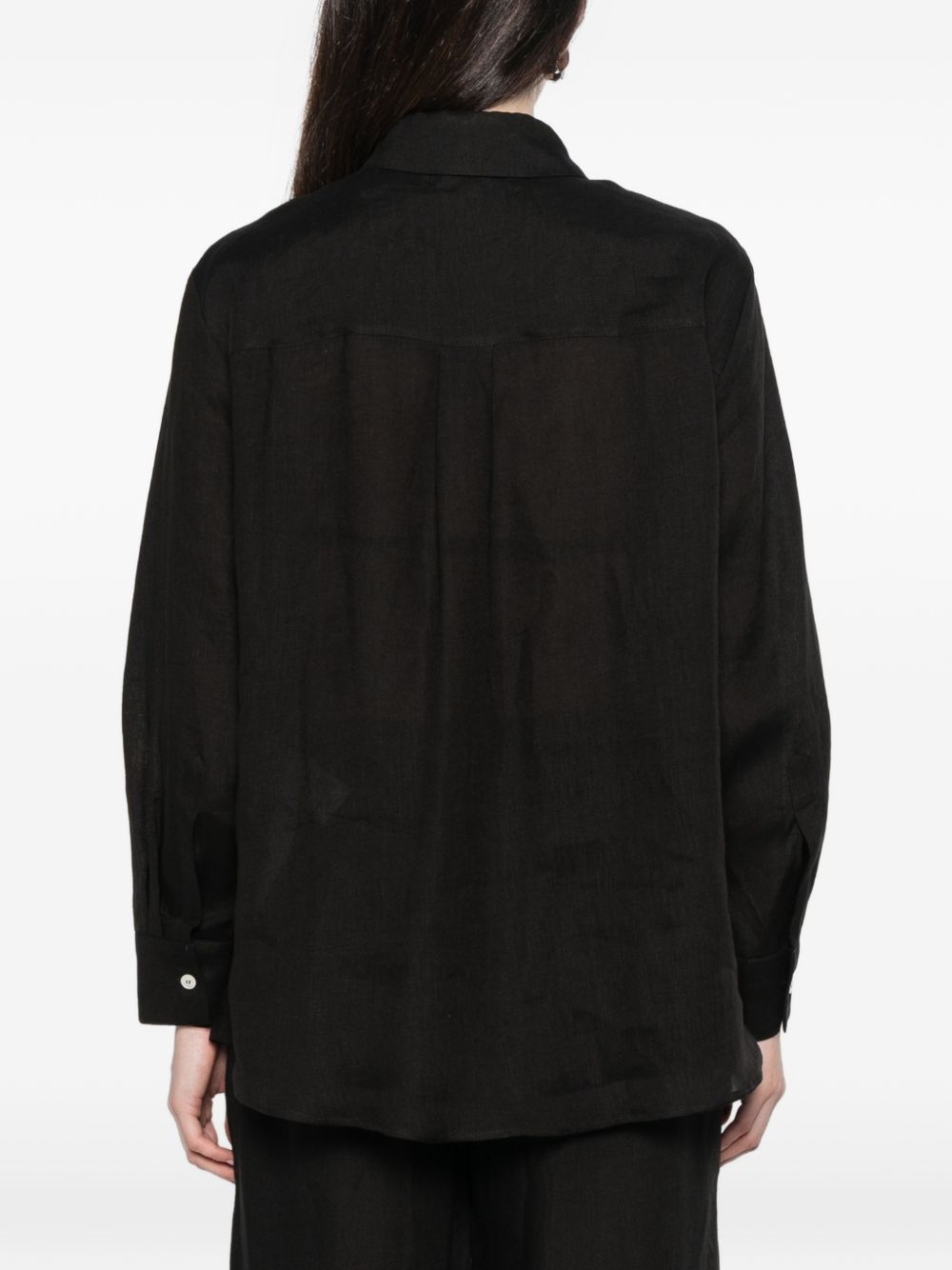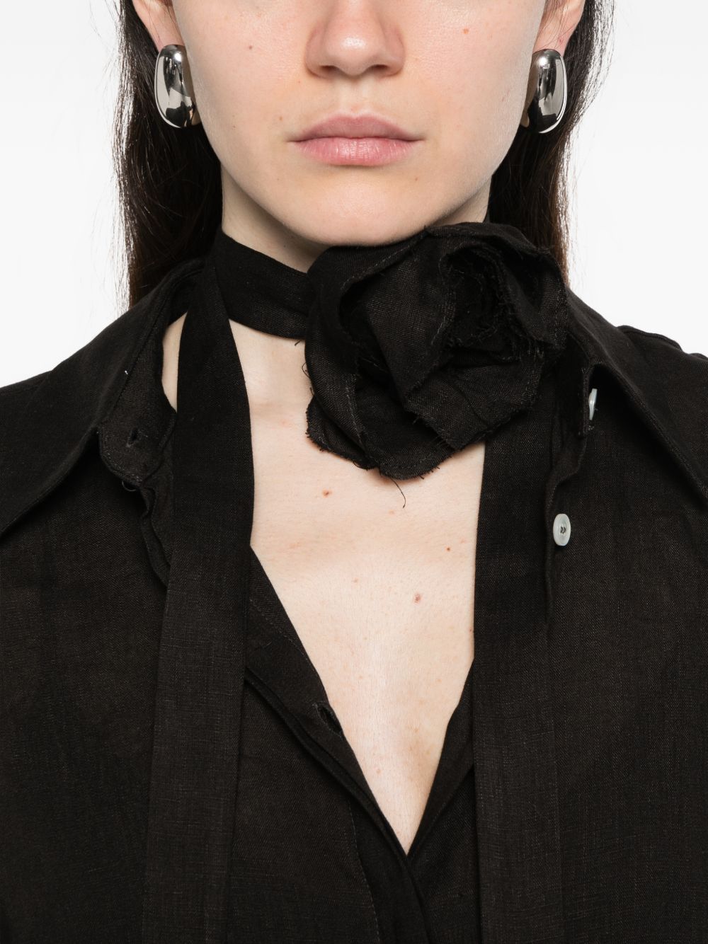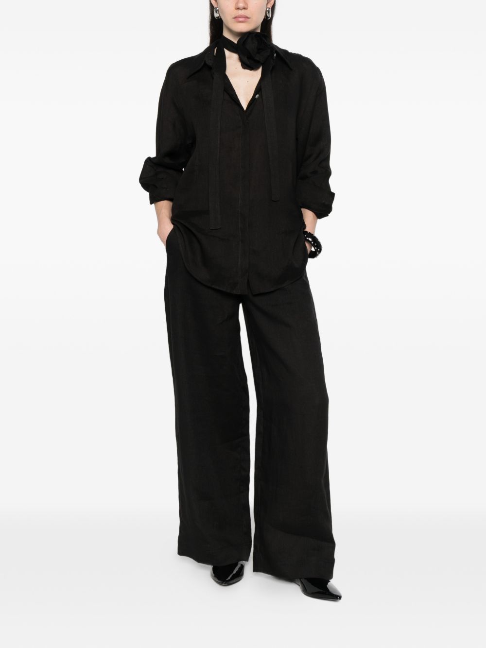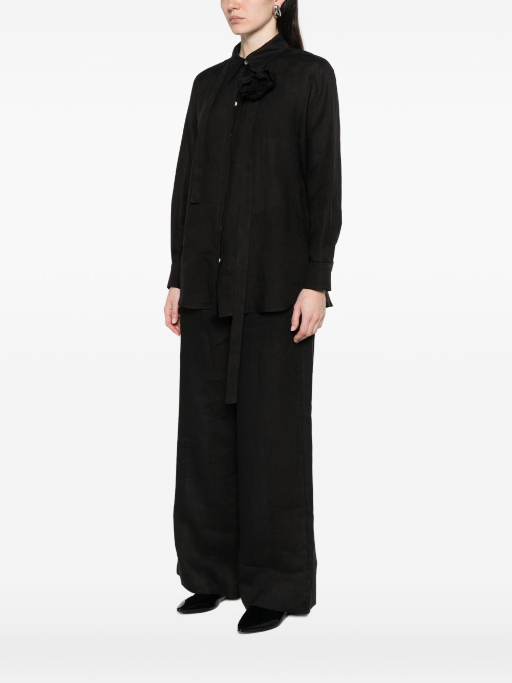 Blusa Marella Sport in lino nero con fiocco, ideale per un look elegante ma leggero.