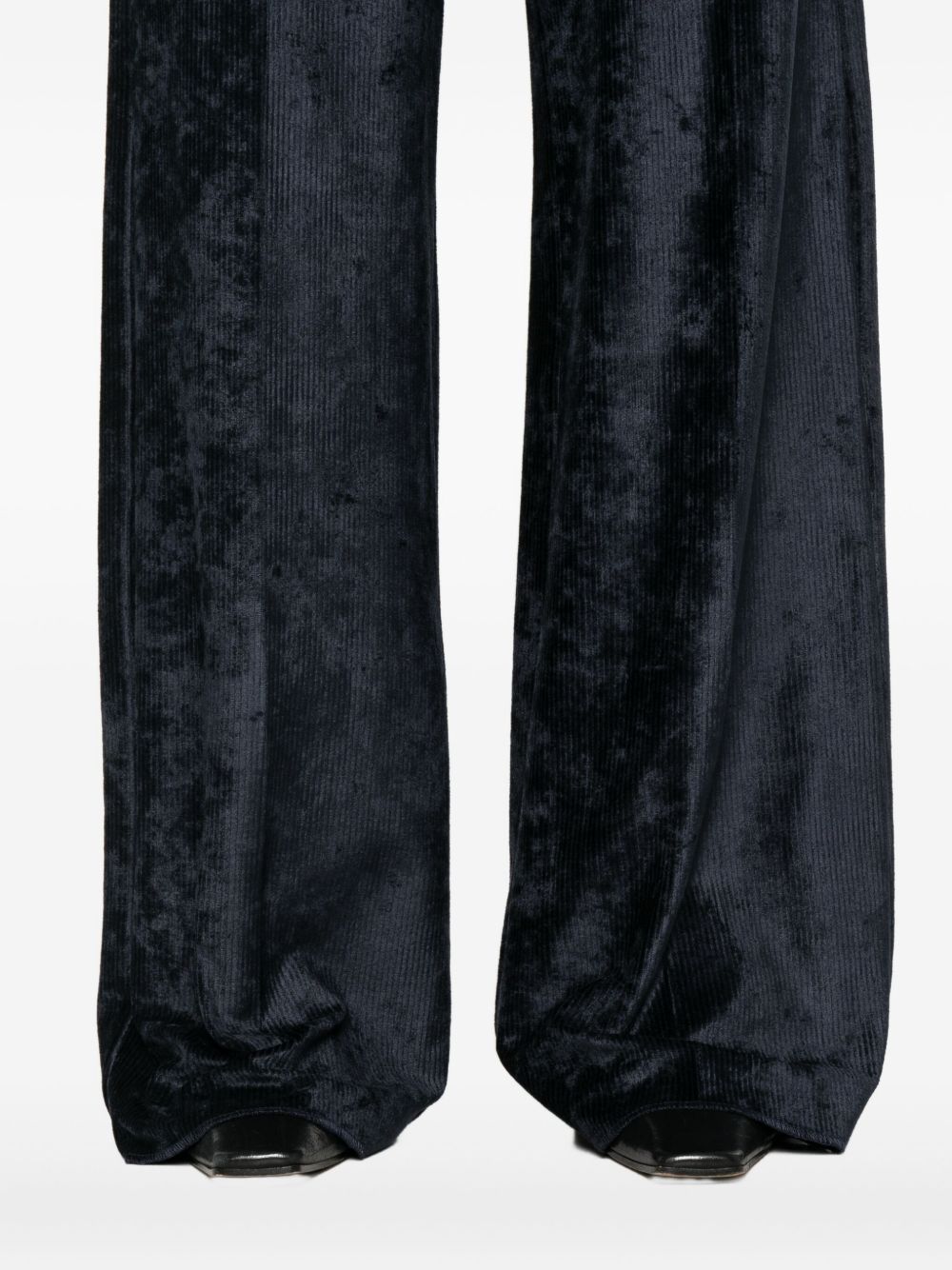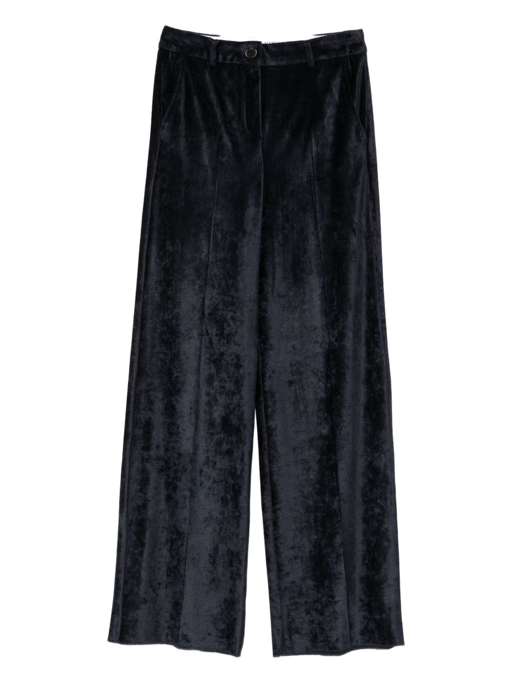 Realizzato in velluto, tessuto a coste, tasche laterali con cuciture, chiusura frontale con cerniera e zip, pieghe davanti, passanti in vita, 100% velluto