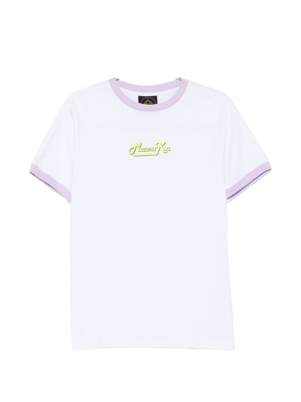 T-shirt Mauna Kea da uomo con bordini a contrasto bianco e lilla, caratterizzata da un design pulito ma con dettaglio grafico evidente.