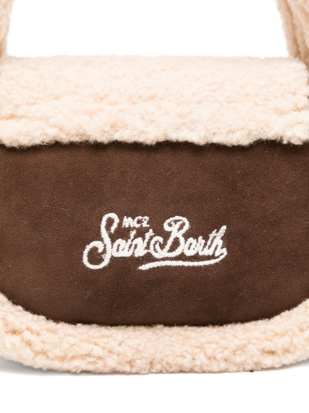 realizzata in tessuto effetto montone, logo ricamato, tracolla regolabile e removibile, lunghezza 18 cm, altezza 15 cm, profondità 10 cm