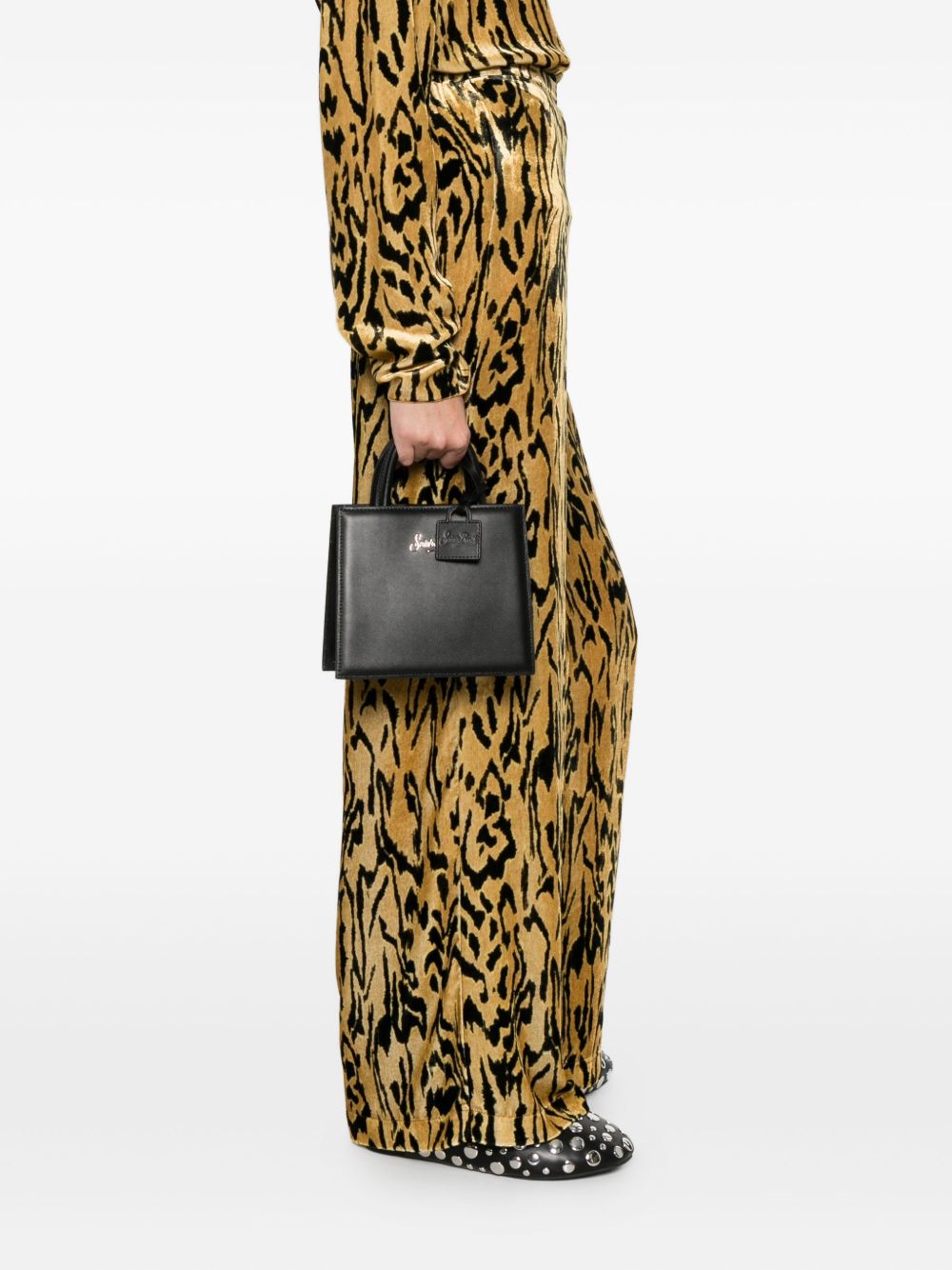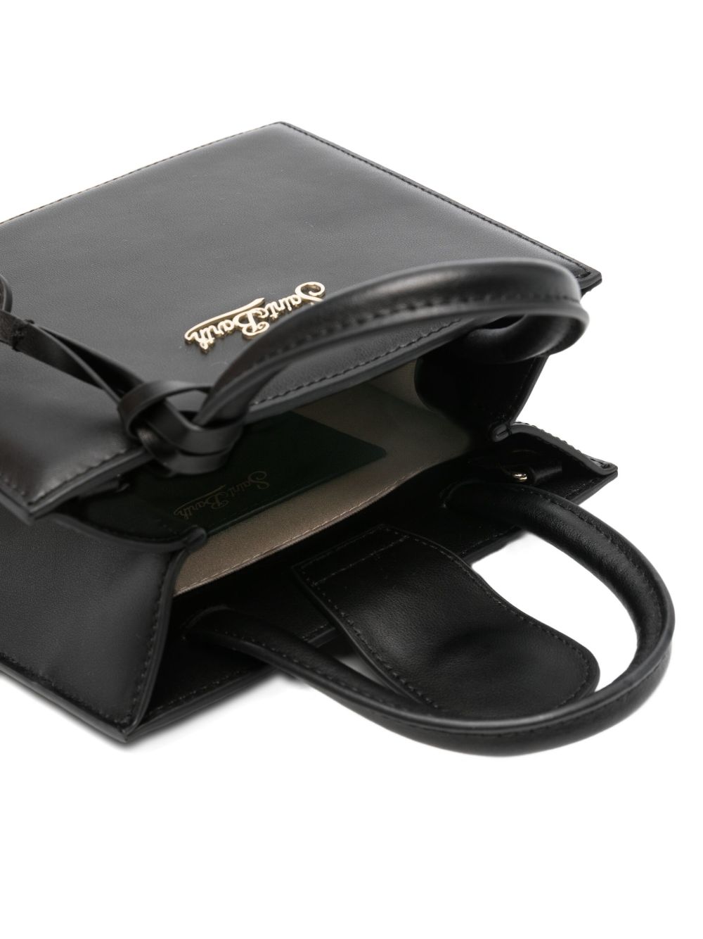 realizzata in pelle lisciata nera, logo placcato, doppio manico, tracolla regolabile e removibile, tasca interna, larghezza 16 cm, altezza 19 cm, profondità 8 cm
