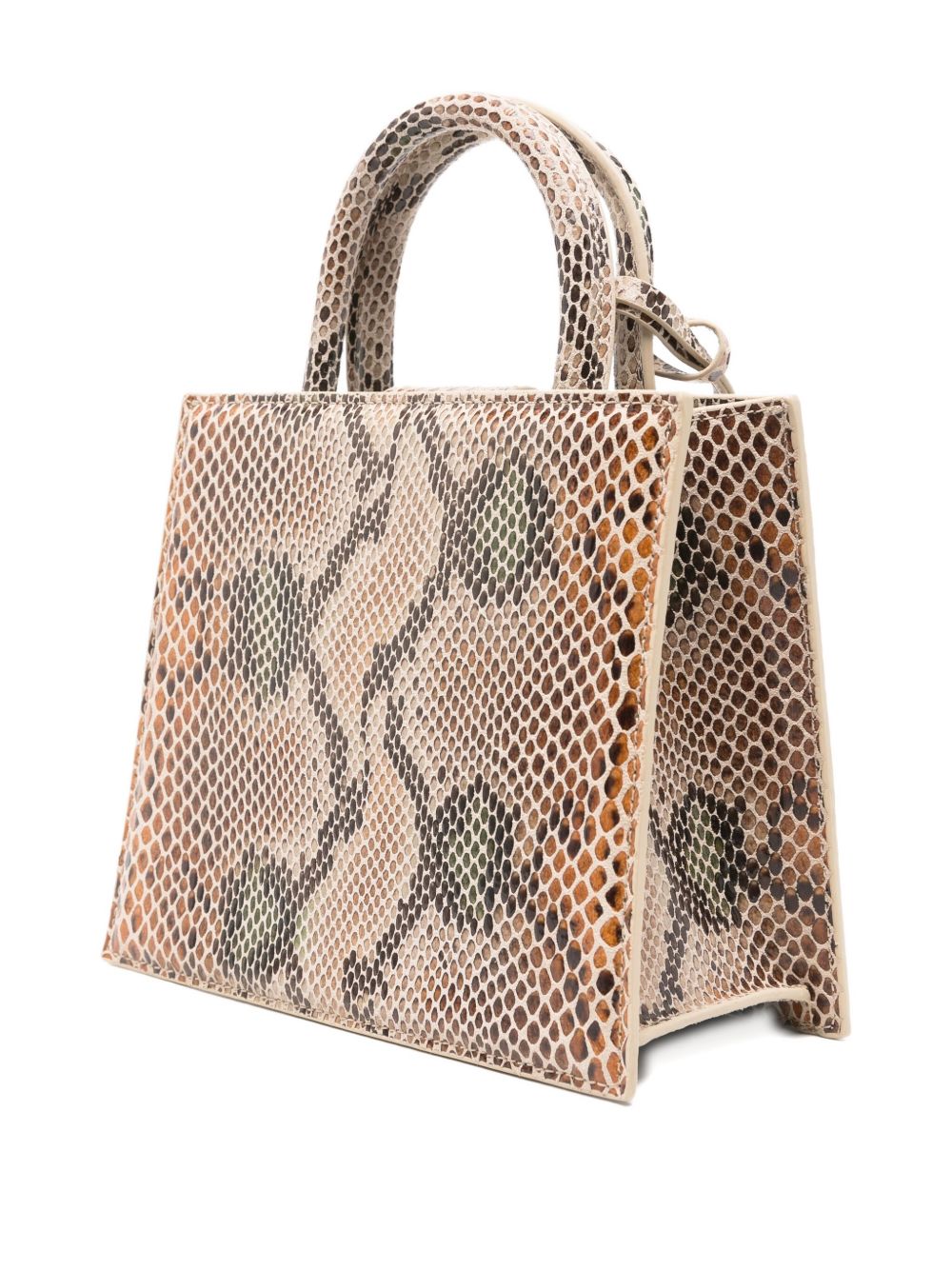 realizzata in pelle stampa pitonata rosa, logo placcato, doppio manico, tracolla regolabile e removibile, tasca interna, larghezza 16 cm, altezza 19 cm, profondità 8 cm