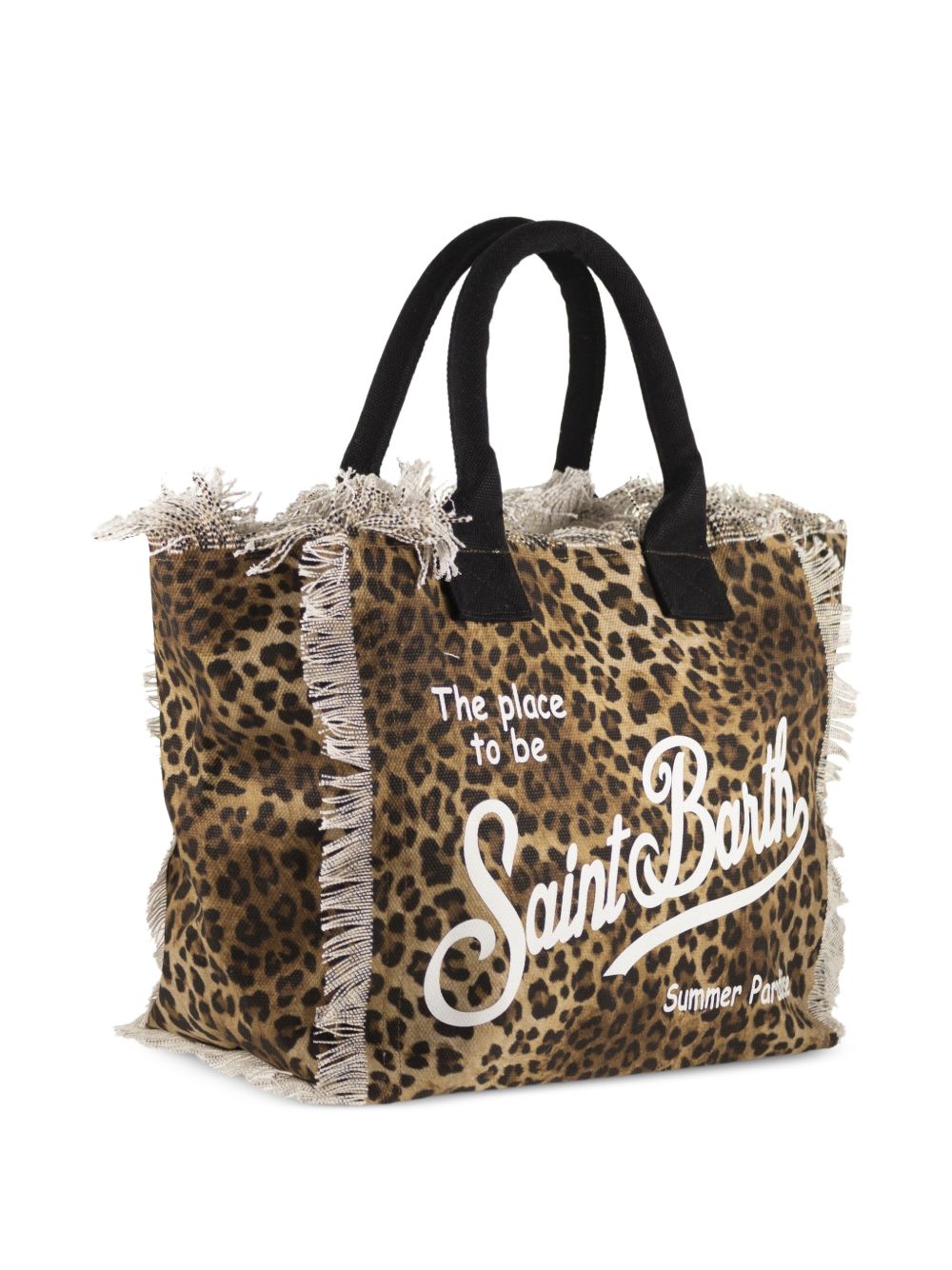 Realizzata in cotone, motivo animalier, doppio manico superiore, stampa logo davanti, chiusura superiore e tasca interna con zip, dettaglio frange, 40 x 32 x 20 cm, 100% cotone